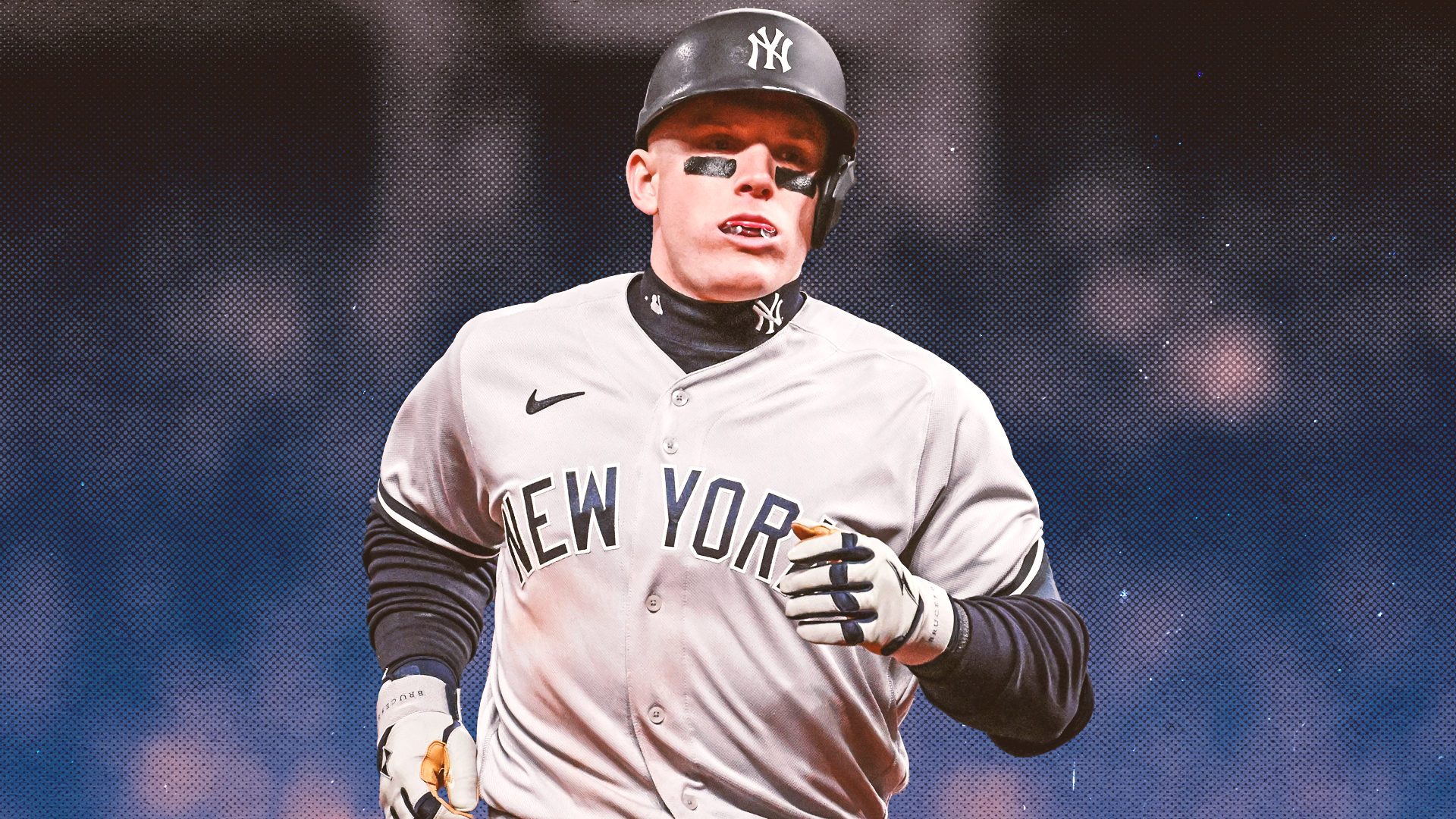 Oct 11, 2022; Bronx, New York, USA; New York Yankees center fielder Harrison Bader (22) hits a home run during the third inning against the Cleveland Guardians in game one of the ALDS for the 2022 MLB Playoffs at Yankee Stadium. / Brad Penner-USA TODAY Sports