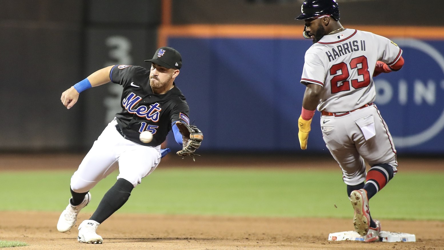 Aug 11, 2023; New York City, New York, USA; New York Mets second baseman Danny Mendick (15) saves the ball from getting past him as Atlanta Braves center fielder Michael Harris II (23) steals second base in the fifth inning at Citi Field. / Wendell Cruz-USA TODAY Sports