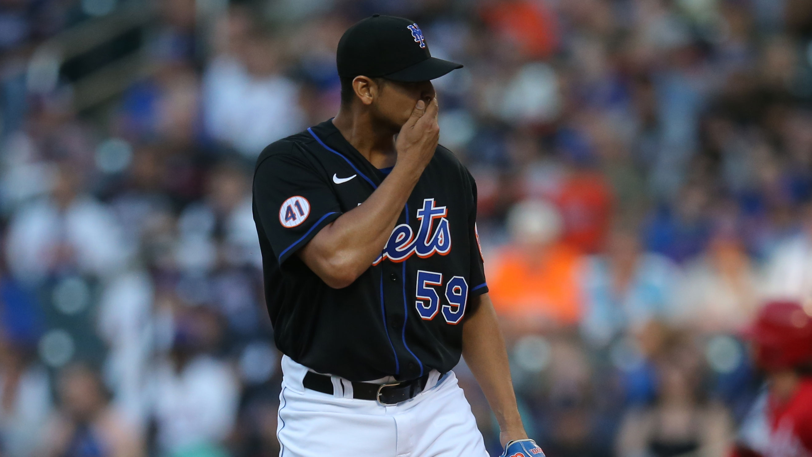 Jul 30, 2021; New York City, New York, USA; New York Mets starting pitcher Carlos Carrasco (59) reacts after giving up a solo home run to Cincinnati Reds second baseman Jonathan India (6) during the first inning at Citi Field. / Brad Penner-USA TODAY Sports