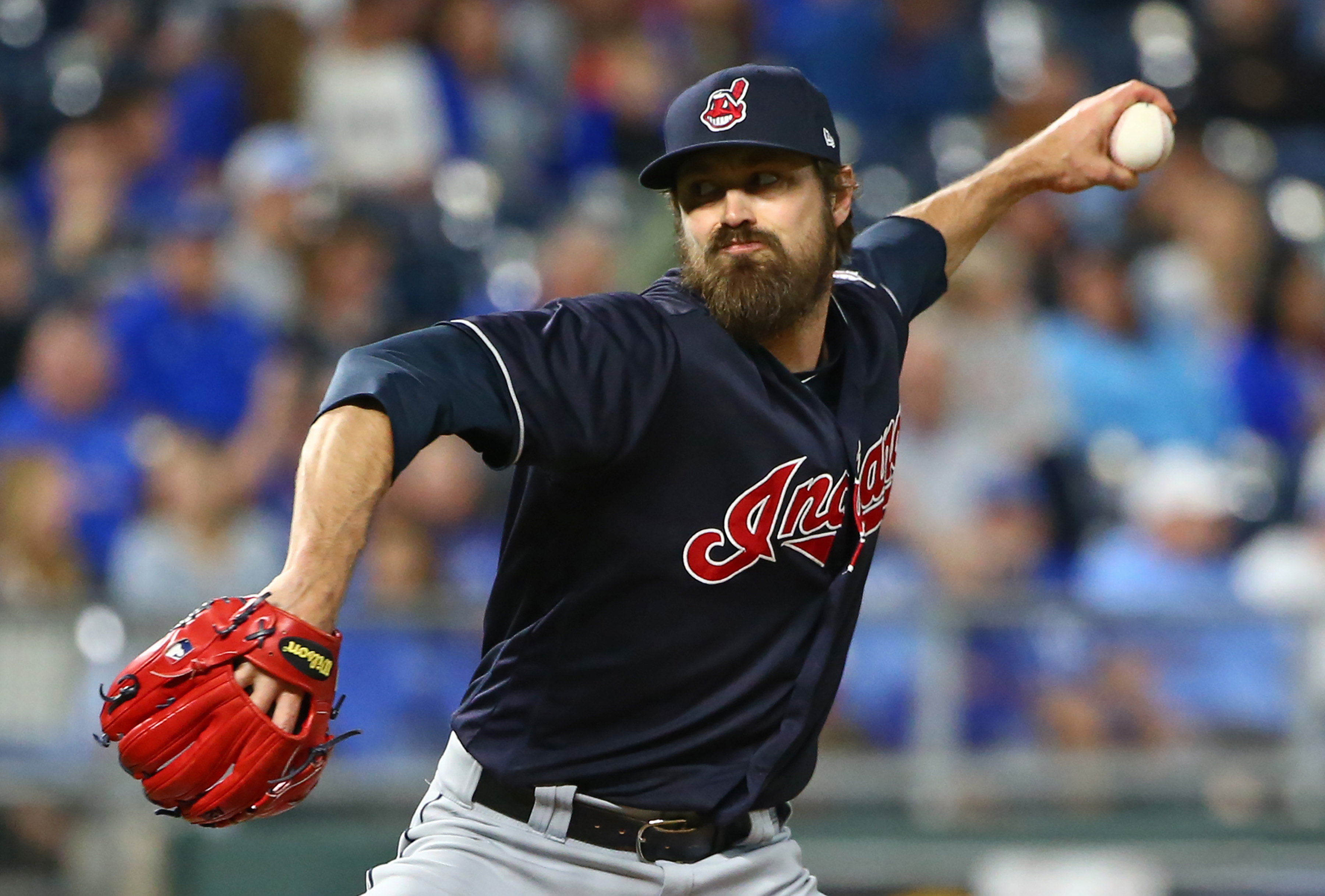 Sep 27, 2018; Kansas City, MO, USA; Cleveland Indians relief pitcher Andrew Miller (24) pitches against the Kansas City Royals in the fifth inning at Kauffman Stadium. Mandatory Credit: Jay Biggerstaff-USA TODAY Sports / Jay Biggerstaff