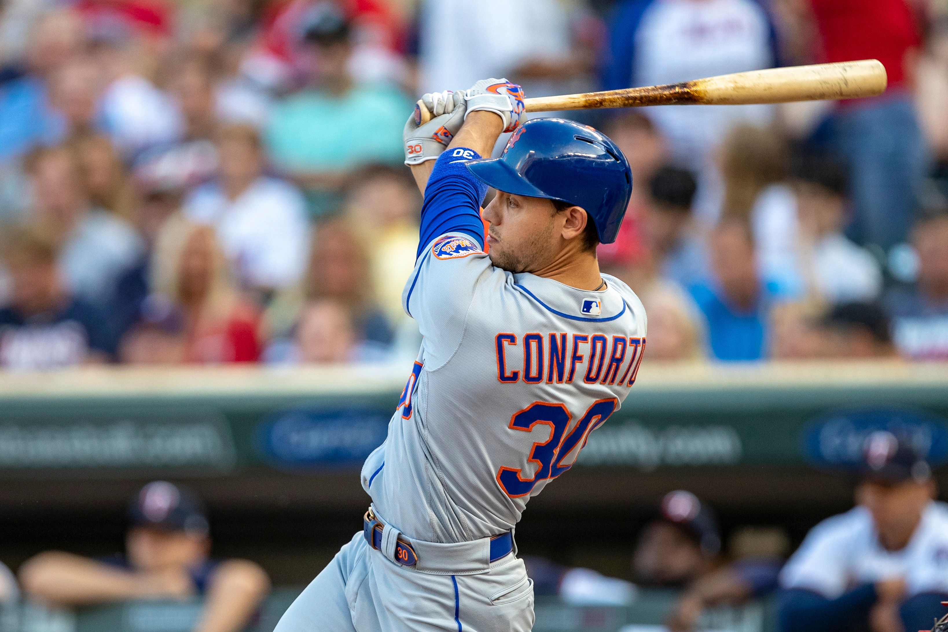 Jul 16, 2019; Minneapolis, MN, USA; New York Mets center fielder Michael Conforto (30) hits a single in the first inning against the Minnesota Twins at Target Field. Mandatory Credit: Jesse Johnson-USA TODAY Sports / Jesse Johnson
