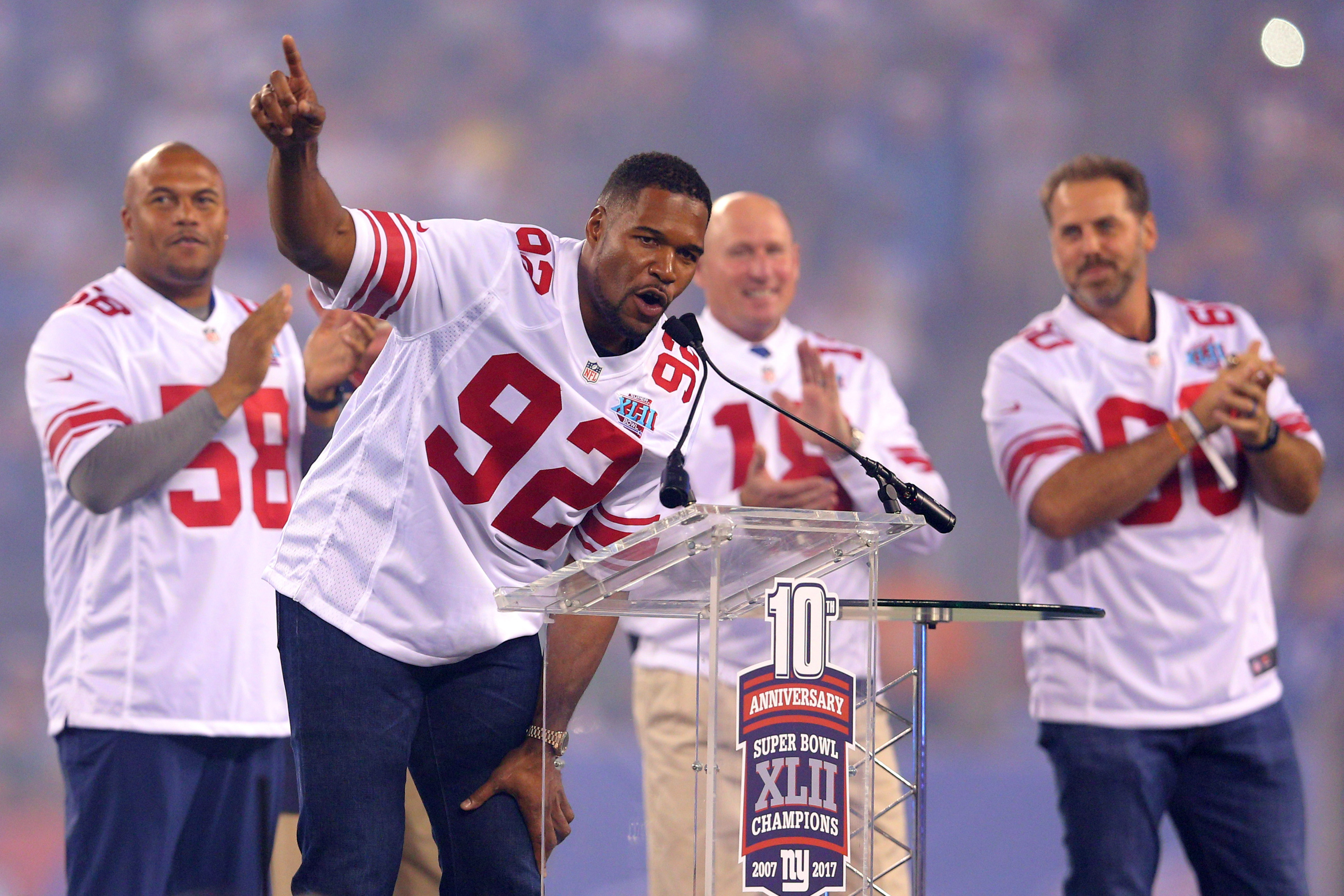 Sep 18, 2017; East Rutherford, NJ, USA; Former New York Giants player Michael Strahan speaks in front of former players Antonio Pierce (58) and Jeff Feagles (18) and Shaun O'Hara (60) during a halftime ceremony honoring the 2007 Super Bowl champion Giants during a game against the Detroit Lions at MetLife Stadium. Mandatory Credit: Brad Penner-USA TODAY Sports / Brad Penner