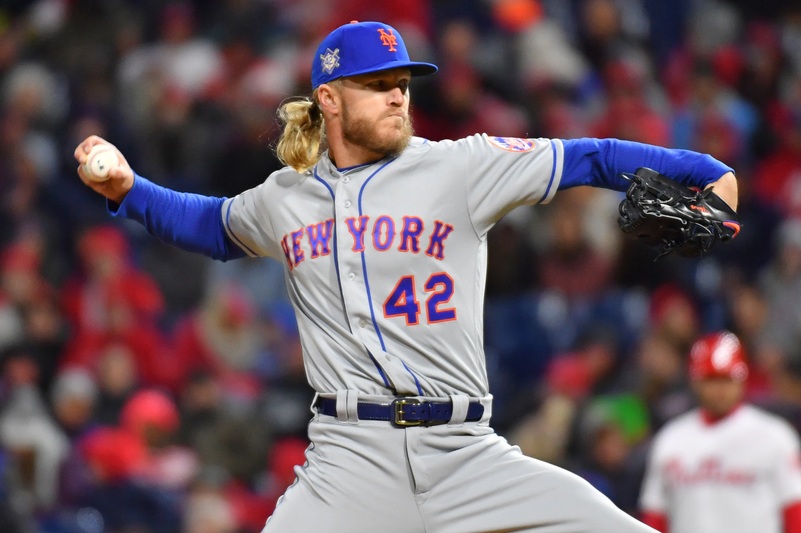 New York Mets starting pitcher Noah Syndergaard throws a pitch during the second inning against the Philadelphia Phillies at Citizens Bank Park. / Eric Hartline/USA TODAY Sports