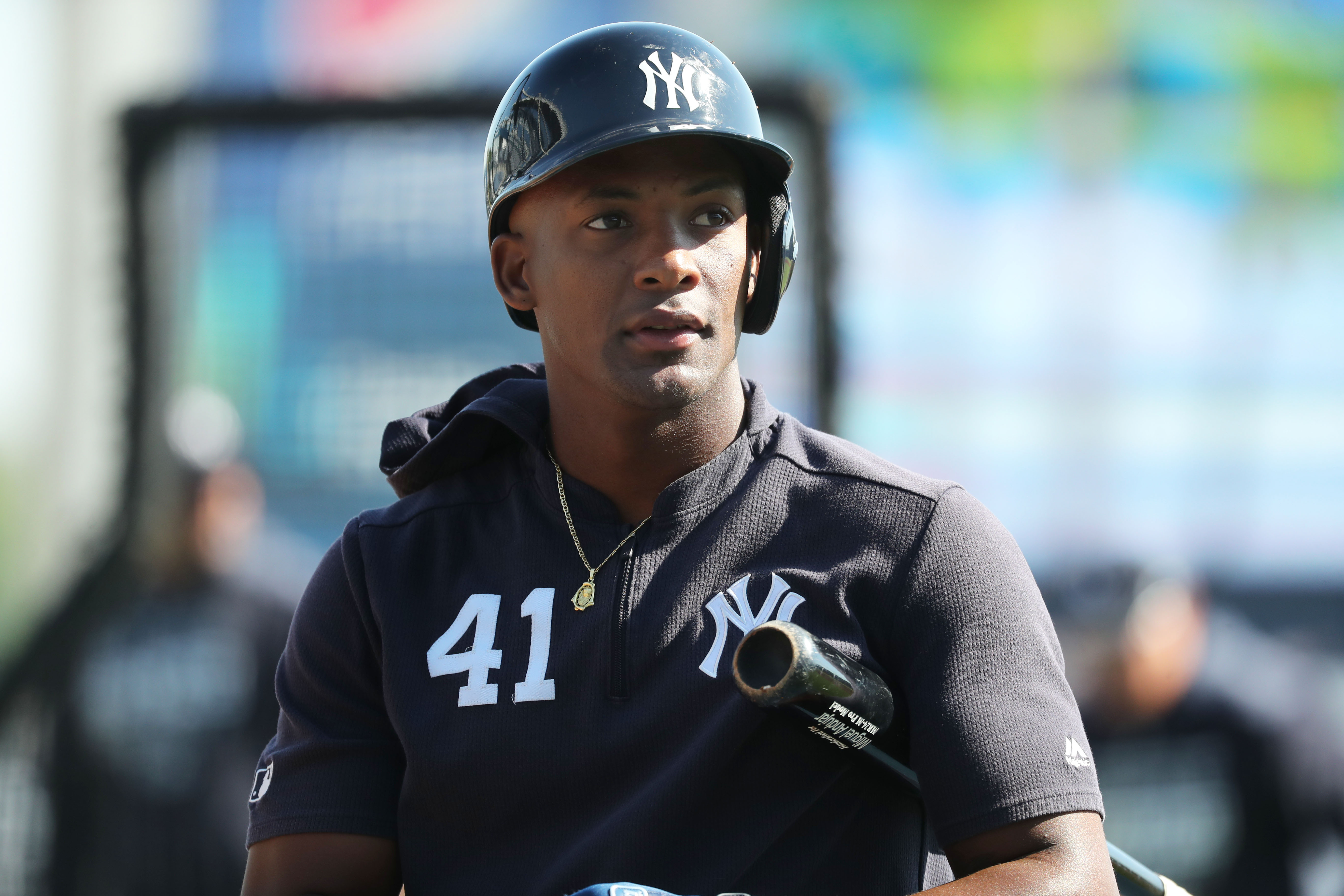 Mar 23, 2019; Tampa, FL, USA; New York Yankees third baseman Miguel Andujar (41) prior to the game against the Toronto Blue Jays at George M. Steinbrenner Field. Mandatory Credit: Kim Klement-USA TODAY Sports / Kim Klement