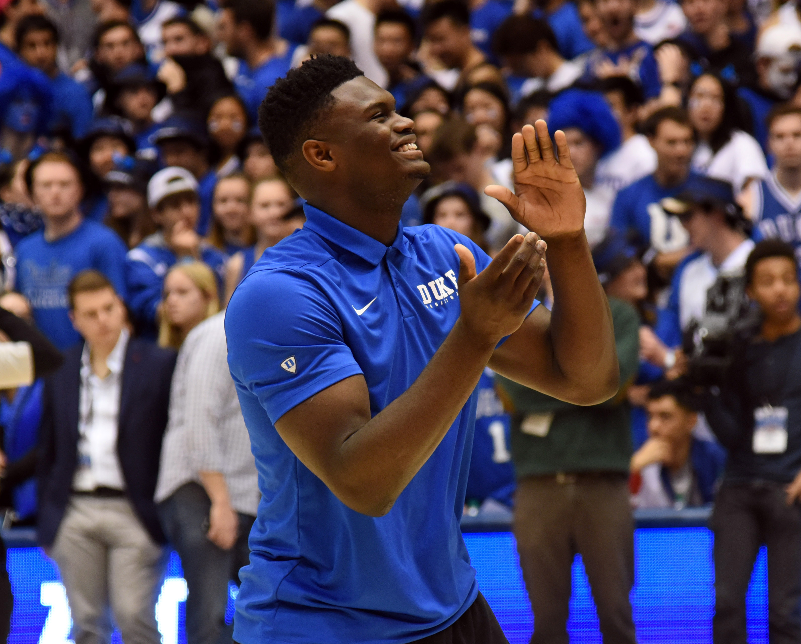 Mar 2, 2019; Durham, NC, USA; Duke Blue Devils forward Zion Williamson (1) watches teammates warm up prior to a game against the Miami Hurricanes at Cameron Indoor Stadium. Mandatory Credit: Rob Kinnan-USA TODAY Sports / Rob Kinnan