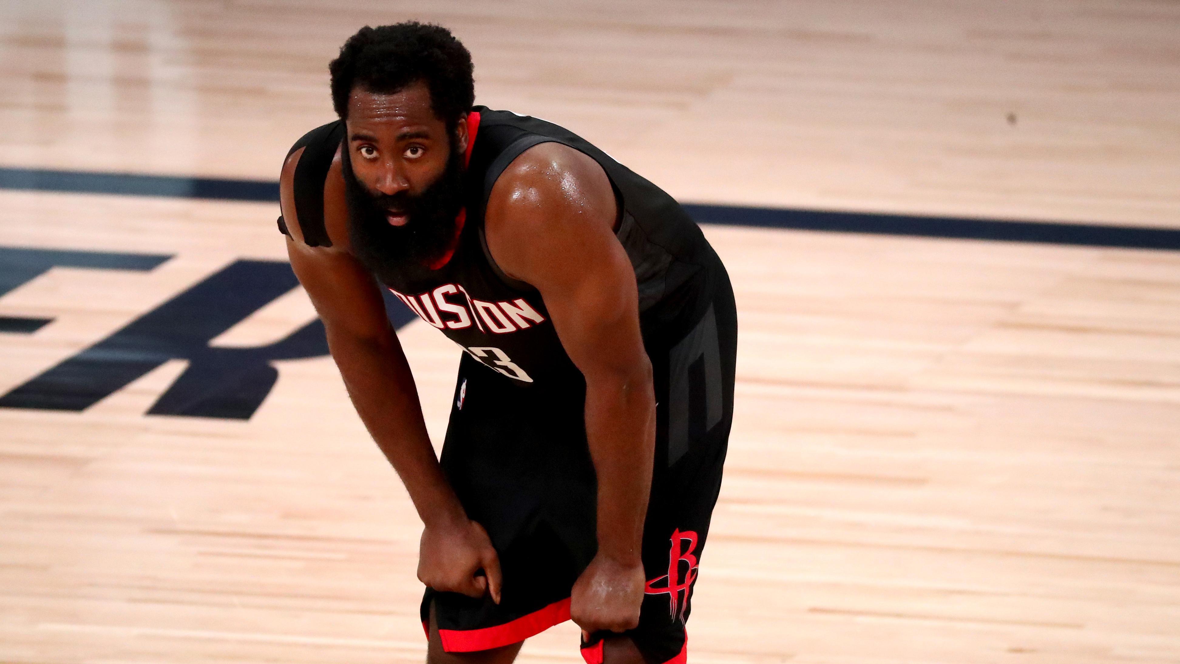 Aug 24, 2020; Lake Buena Vista, Florida, USA; Houston Rockets guard James Harden (13) takes a break during the second half in game four of the first round of the 2020 NBA Playoffs against the Oklahoma City Thunder at AdventHealth Arena. / Kim Klement-USA TODAY Sports