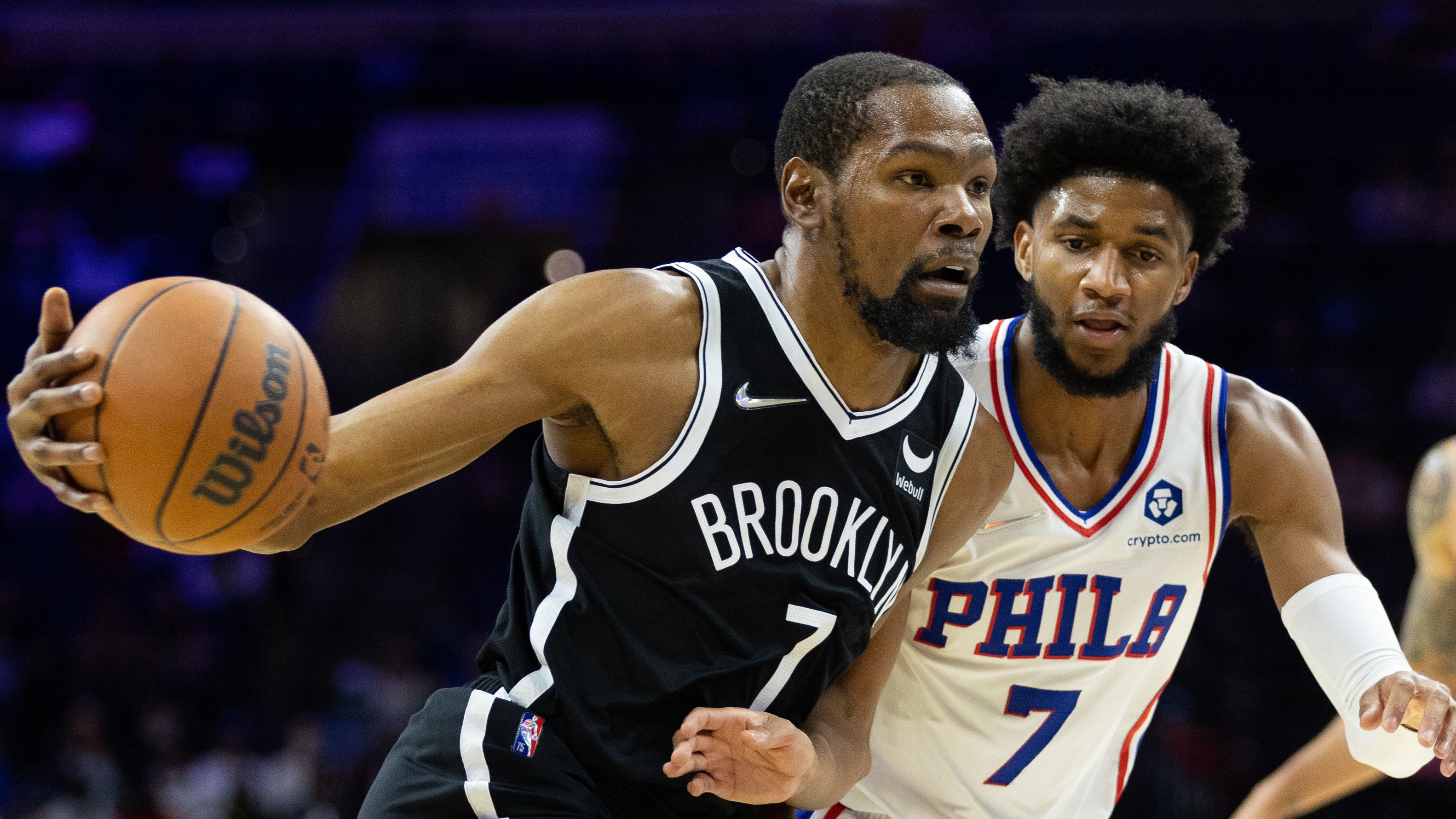 Nets takeaways from 115-104 preseason loss at 76ers, including Kevin Durant and James Harden without Kyrie IrvingKyrie Irving did not travel with Brooklyn to Philadelphia10/12/2021, 2:45 AMGarrett StepienFreelance Editorial ProducerOct 11, 2021; Philadelphia, Pennsylvania, USA; Brooklyn Nets forward Kevin Durant (left) drives the ball against Philadelphia 76ers guard Isaiah Joe (right) during the first quarter at Wells Fargo Center. Mandatory Credit: Bill Streicher-USA TODAY Sports / © Bill Streicher-USA TODAY Sports