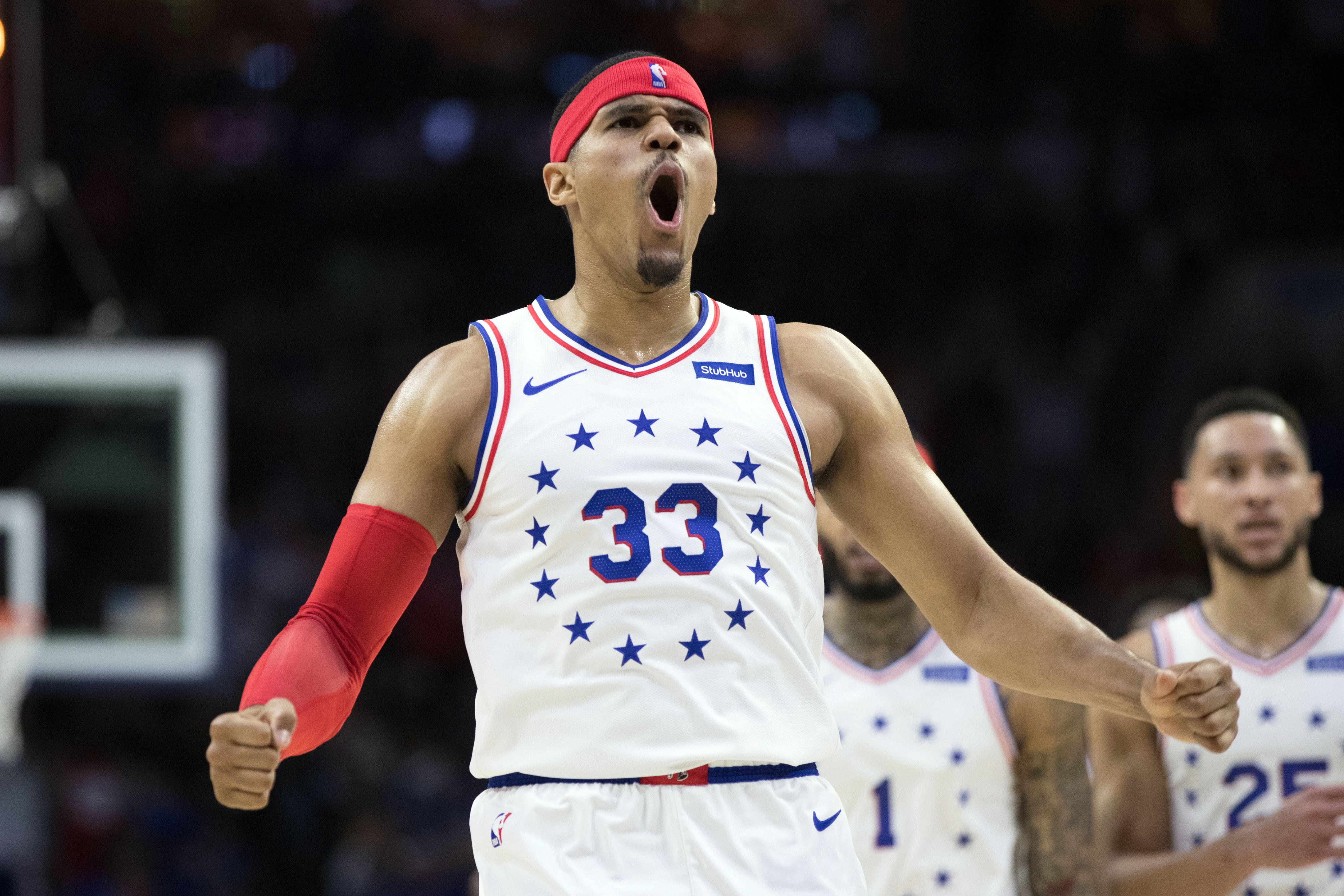May 9, 2019; Philadelphia, PA, USA; Philadelphia 76ers forward Tobias Harris (33) reacts during the first quarter against the Toronto Raptors in game six of the second round of the 2019 NBA Playoffs at Wells Fargo Center. Mandatory Credit: Bill Streicher-USA TODAY Sports / Bill Streicher
