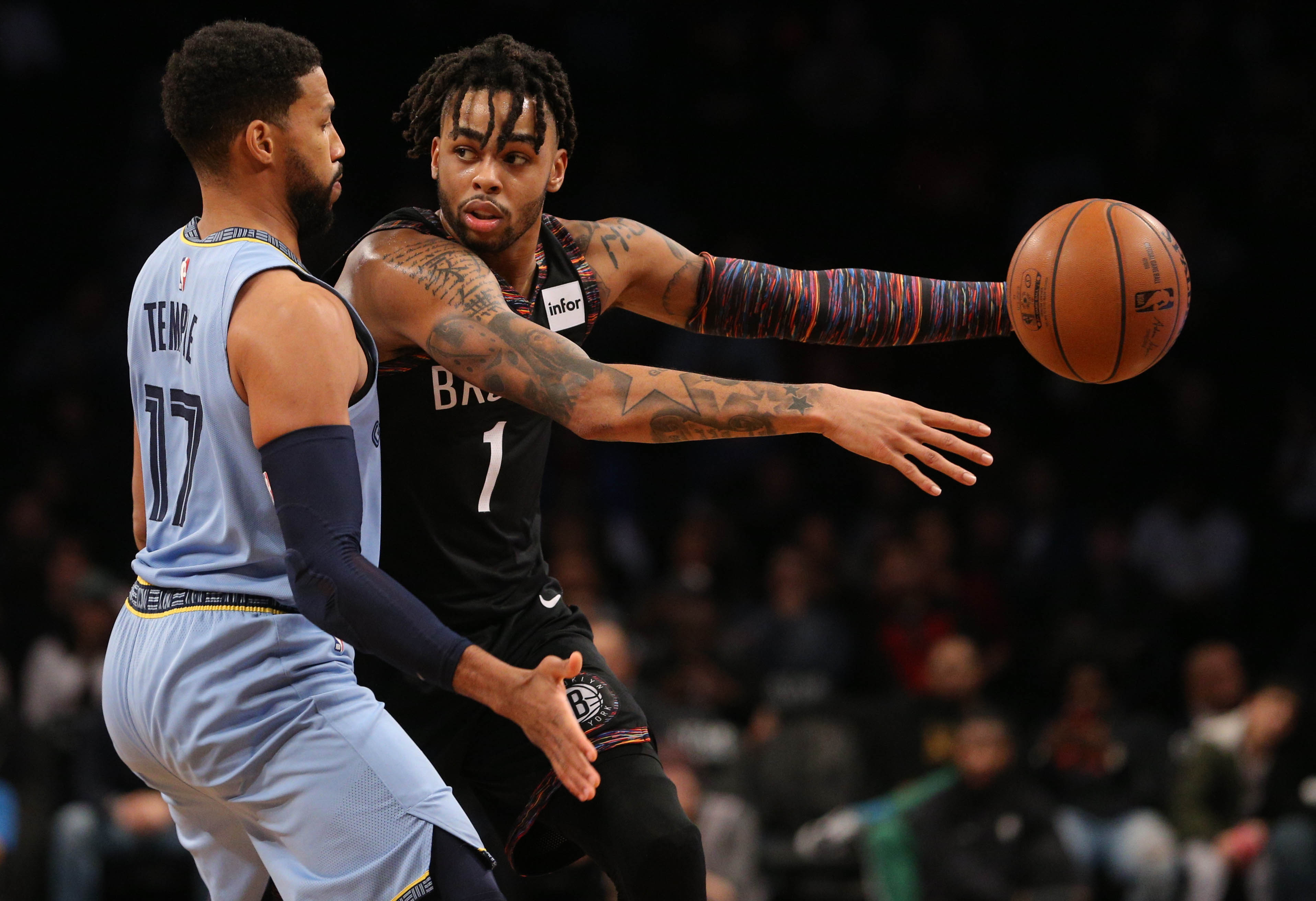 Nov 30, 2018; Brooklyn, NY, USA; Brooklyn Nets point guard D'Angelo Russell (1) plays the ball against Memphis Grizzlies shooting guard Garrett Temple (17) during the fourth quarter at Barclays Center. Mandatory Credit: Brad Penner-USA TODAY Sports / Brad Penner