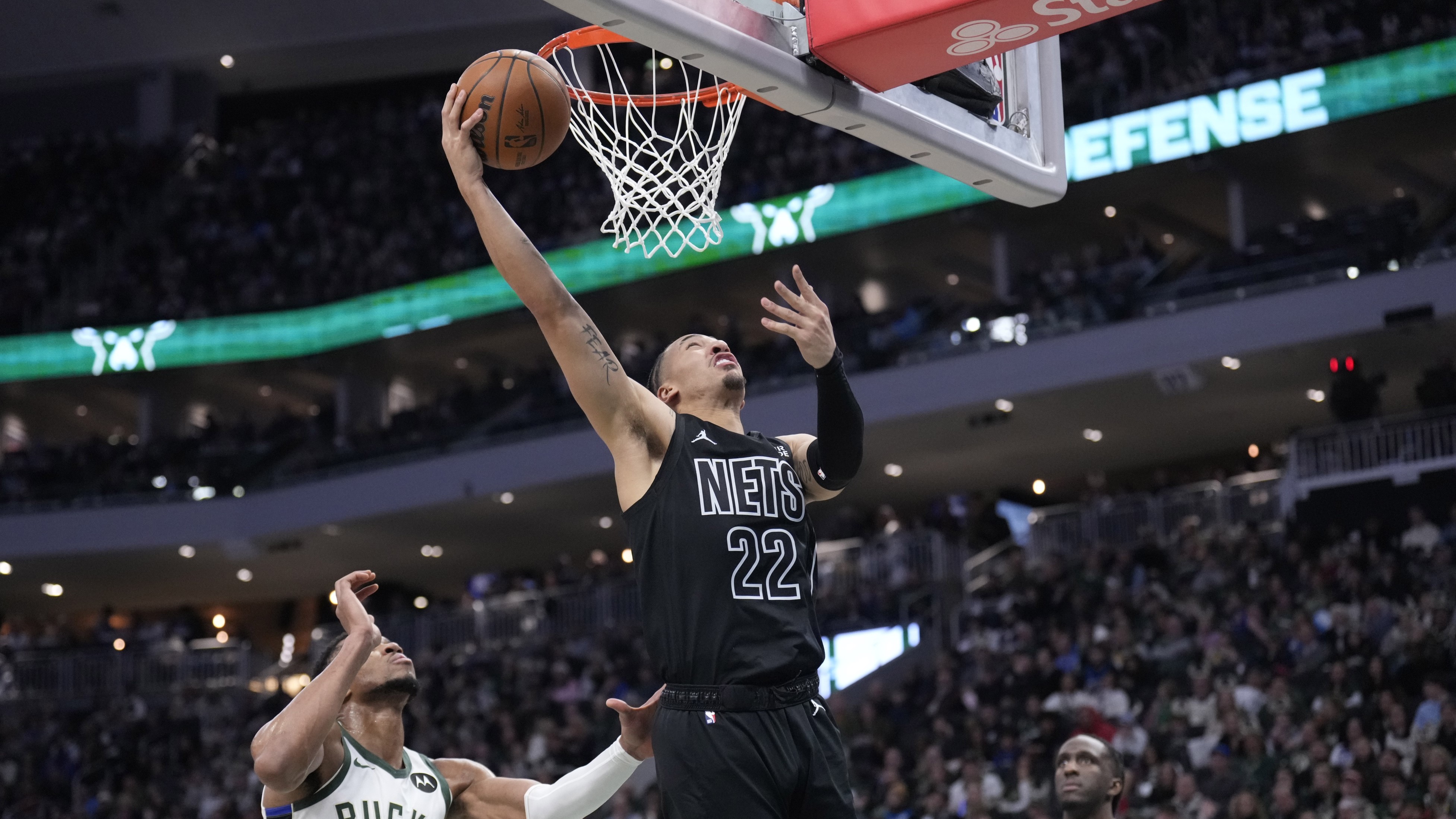 Jan 2, 2025; Milwaukee, Wisconsin, USA; Brooklyn Nets forward Jalen Wilson (22) puts up a shot against Milwaukee Bucks forward Giannis Antetokounmpo (34) and Milwaukee Bucks forward Taurean Prince (12) in the second half at Fiserv Forum. / Michael McLoone-Imagn Images