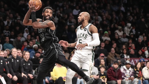 Brooklyn, New York, USA; Brooklyn Nets guard Kyrie Irving (11) is guarded by Milwaukee Bucks guard Jevon Carter (5) in the second quarter at Barclays Center / Wendell Cruz - USA TODAY Sports