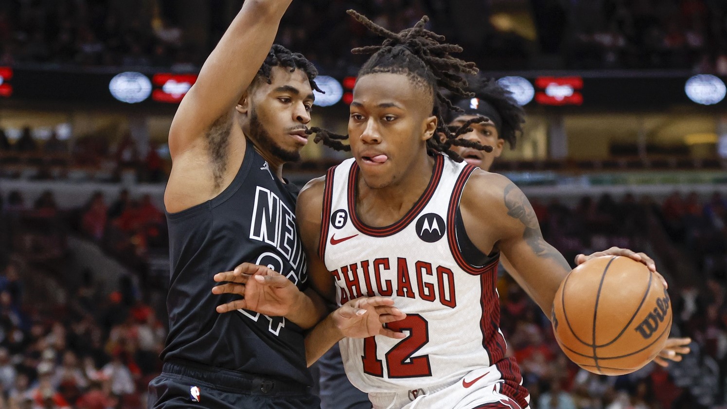 Feb 24, 2023; Chicago, Illinois, USA; Chicago Bulls guard Ayo Dosunmu (12) drives to the basket against Brooklyn Nets guard Cam Thomas (24) during the first half at United Center. / Kamil Krzaczynski-USA TODAY Sports