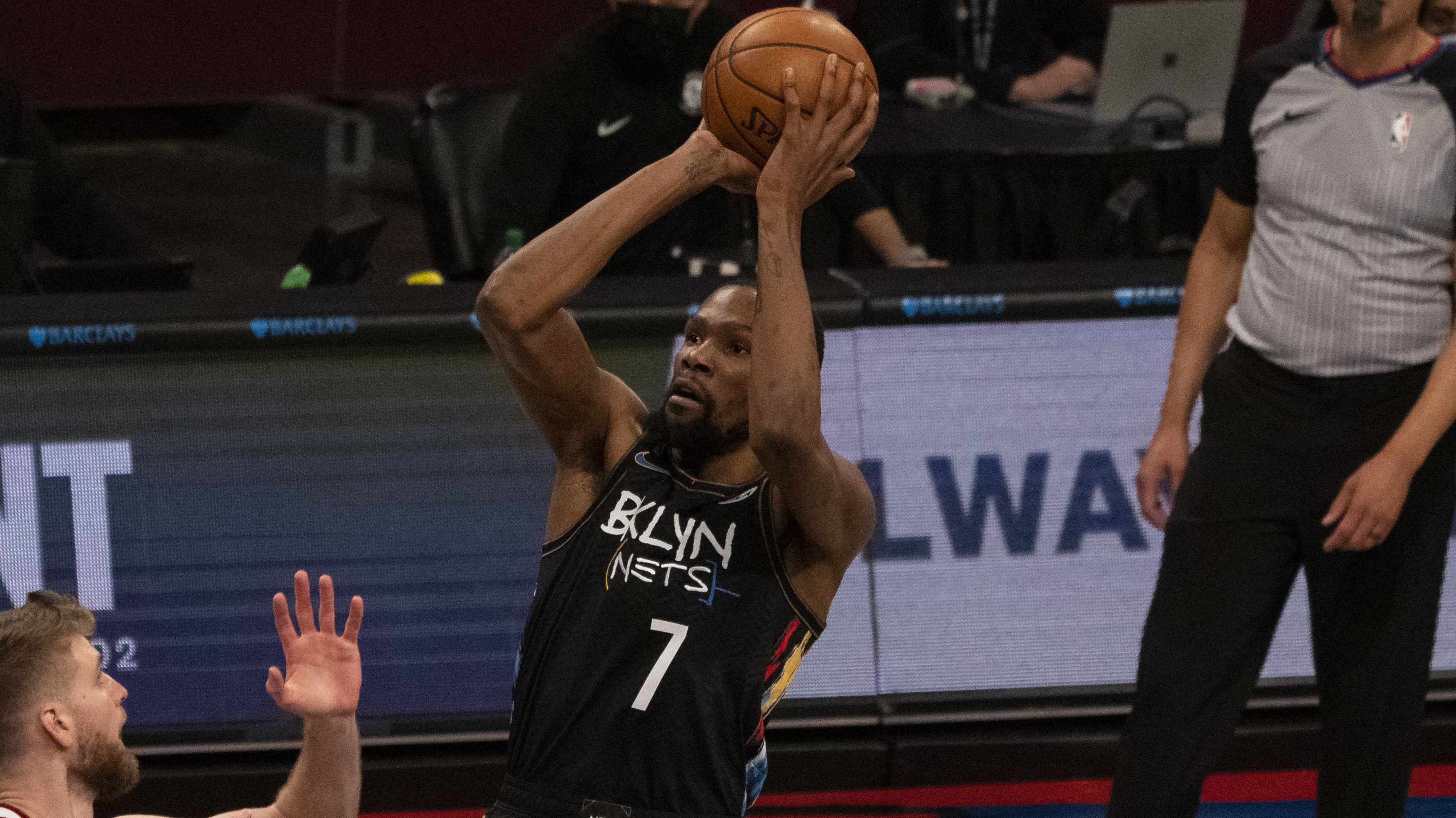 Kevin Durant, Kyrie Irving power Nets past Cavs 123-109 for No. 2 seed in EastBrooklyn ends the regular season on a five-game winning streak5/17/2021, 1:40 AMMay 16, 2021; Brooklyn, New York, USA; Brooklyn Nets power forward Kevin Durant (7) shoots a jump shot during the second quarter against the Cleveland Cavaliers at Barclays Center. Mandatory Credit: Gregory Fisher-USA TODAY Sports / © Gregory Fisher-USA TODAY Sports