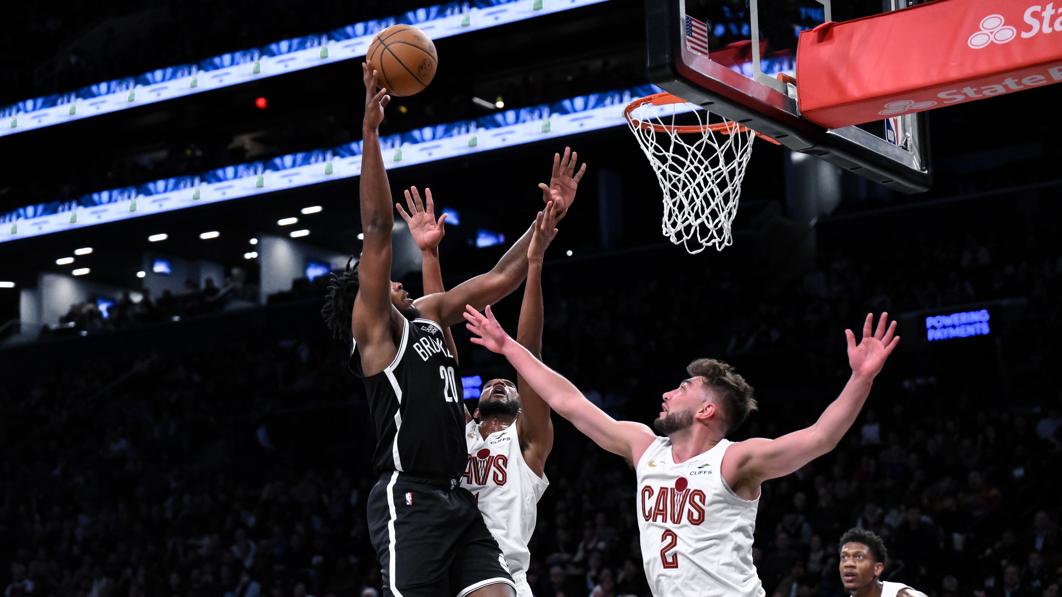 Feb 20, 2025; Brooklyn, New York, USA; Brooklyn Nets center Day'Ron Sharpe (20) shoots the ball while being defended by Cleveland Cavaliers forward Evan Mobley (4) and guard Ty Jerome (2) during the first half at Barclays Center. / John Jones-Imagn Images
