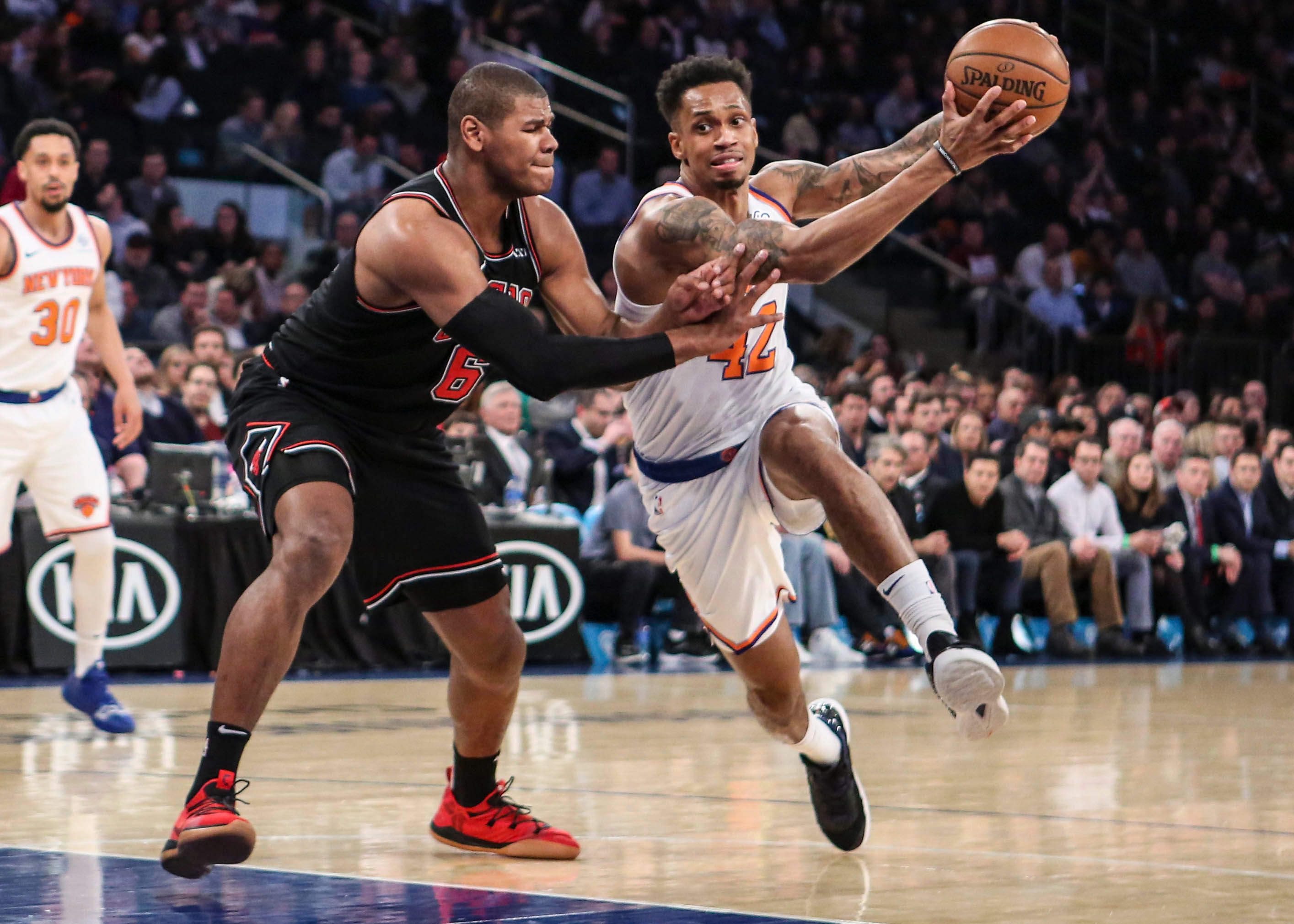Apr 1, 2019; New York, NY, USA; New York Knicks forward Lance Thomas (42) drives past Chicago Bulls guard Cristiano Felicio (6) in the second quarter at Madison Square Garden. Mandatory Credit: Wendell Cruz-USA TODAY Sports / Wendell Cruz-USA TODAY Sports