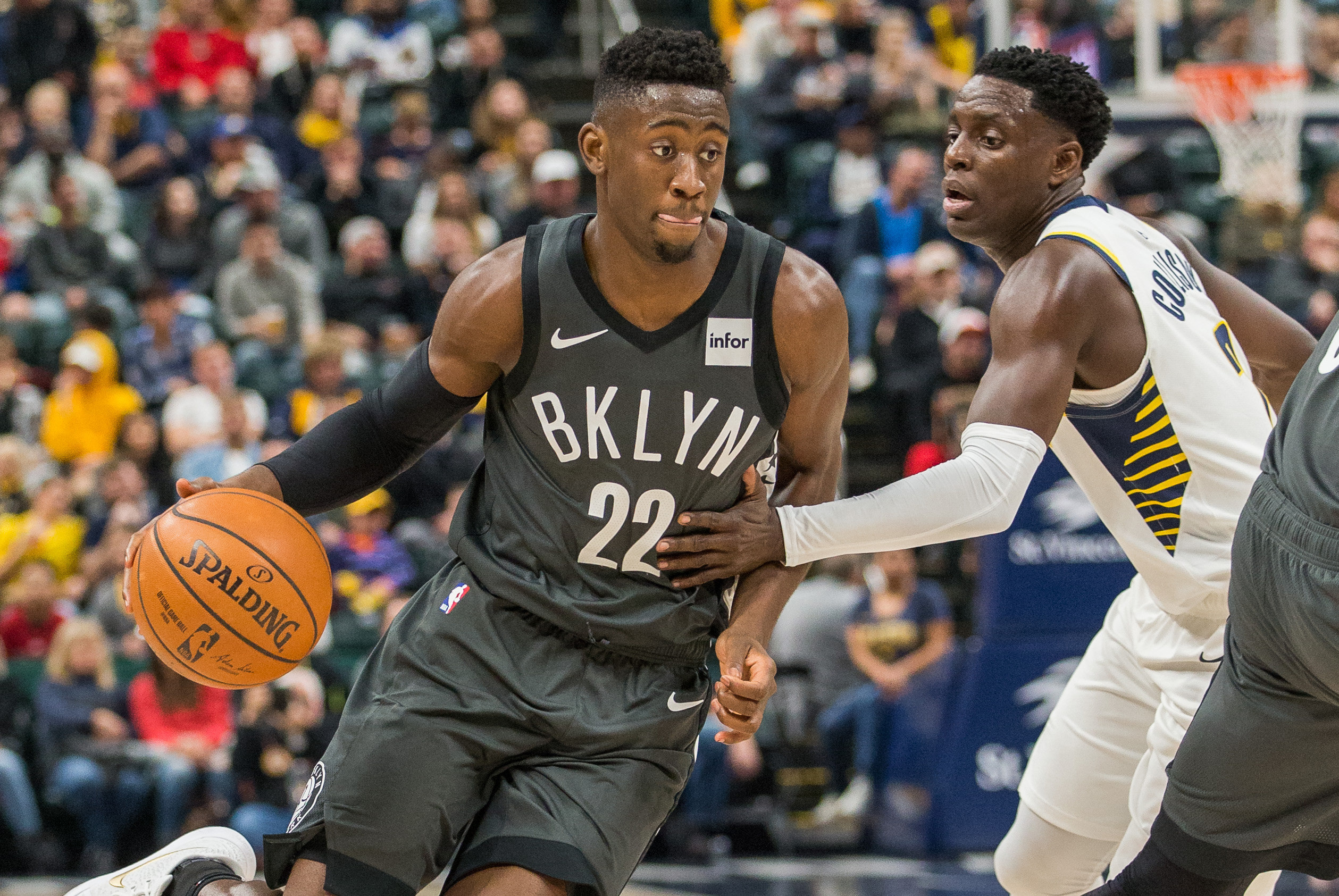 Oct 20, 2018; Indianapolis, IN, USA; Brooklyn Nets guard Caris LeVert (22) dribbles the ball while Indiana Pacers guard Darren Collison (2) defends in the second half at Bankers Life Fieldhouse. Mandatory Credit: Trevor Ruszkowski-USA TODAY Sports / Trevor Ruszkowski
