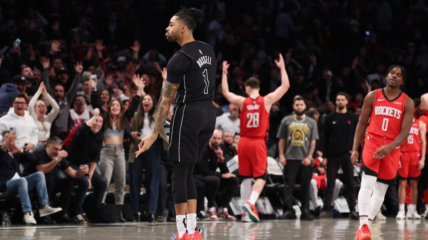 Feb 4, 2025; Brooklyn, New York, USA; Brooklyn Nets guard D'Angelo Russell (1) celebrates after making the game-winning three point basket with 3.1 seconds remaining in the fourth quarter to defeat the Houston Rockets at Barclays Center. / Vincent Carchietta-Imagn Images