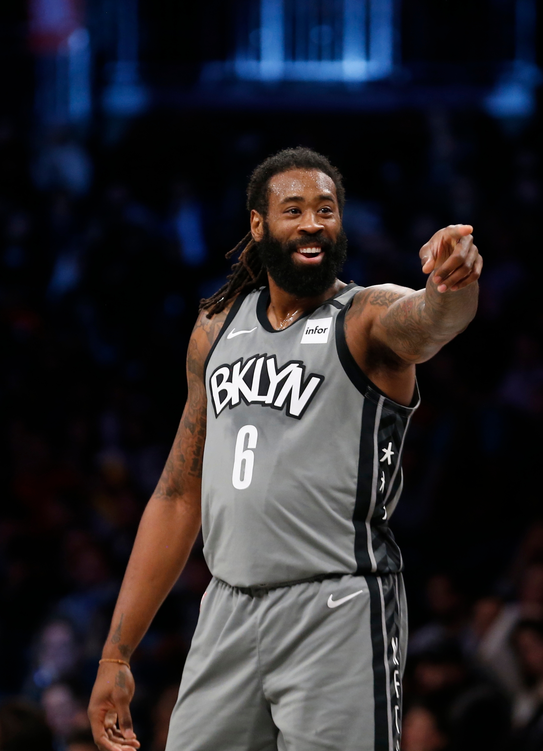Jan 7, 2020; Brooklyn, New York, USA; Brooklyn Nets center Deandre Jordan (6) reacts in the third quarter against the Oklahoma City Thunder at Barclays Center. Mandatory Credit: Nicole Sweet-USA TODAY Sports / Nicole Sweet