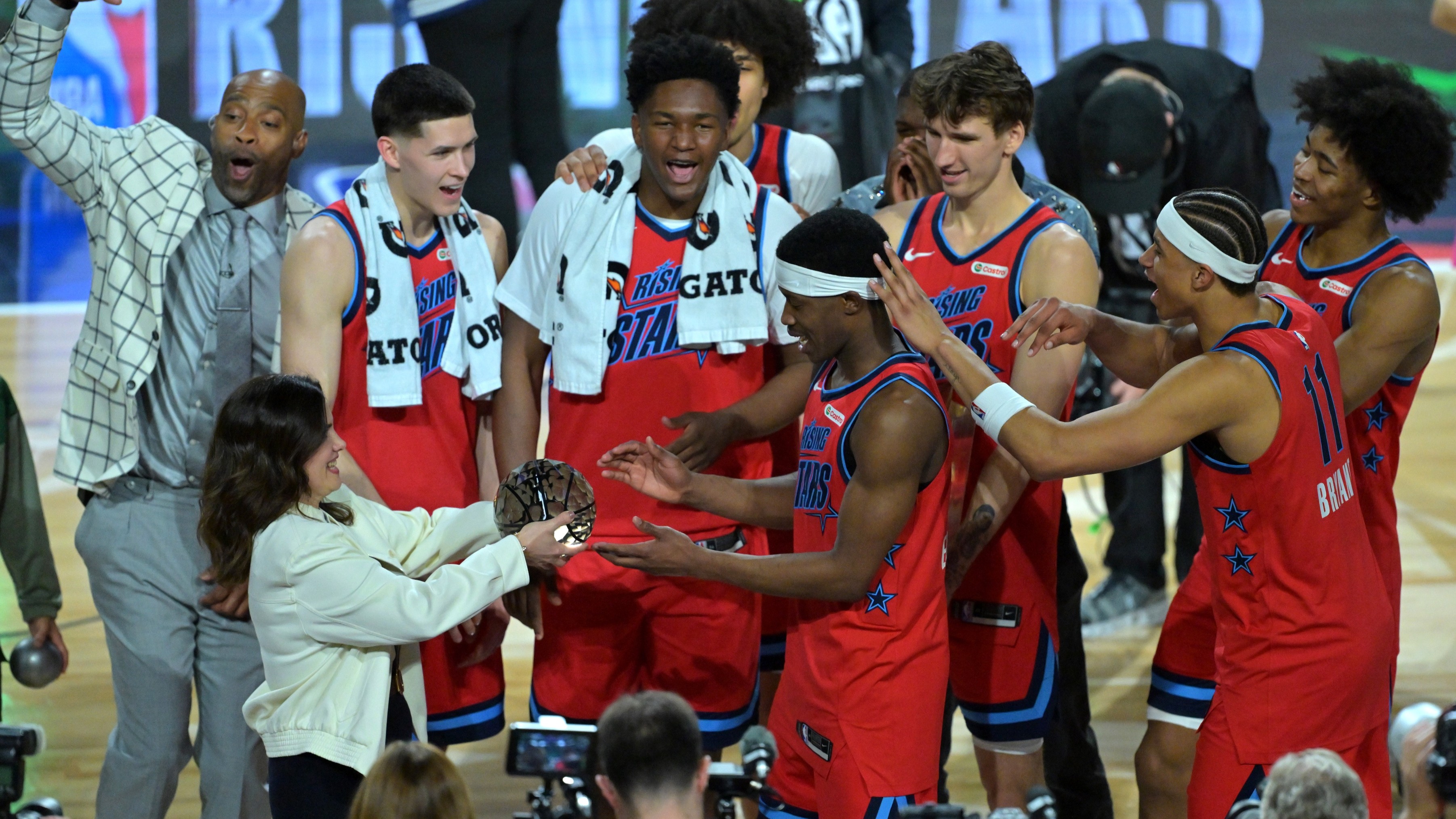 Feb 13, 2026; Inglewood, California, USA; Team Vince guard VJ Edgecombe (77) of the Philadelphia 76ers reacts with the MVP trophy after defeating Team Melo during an NBA All Star Rising Stars championship game at Intuit Dome. / Jayne Kamin-Oncea-Imagn Images
