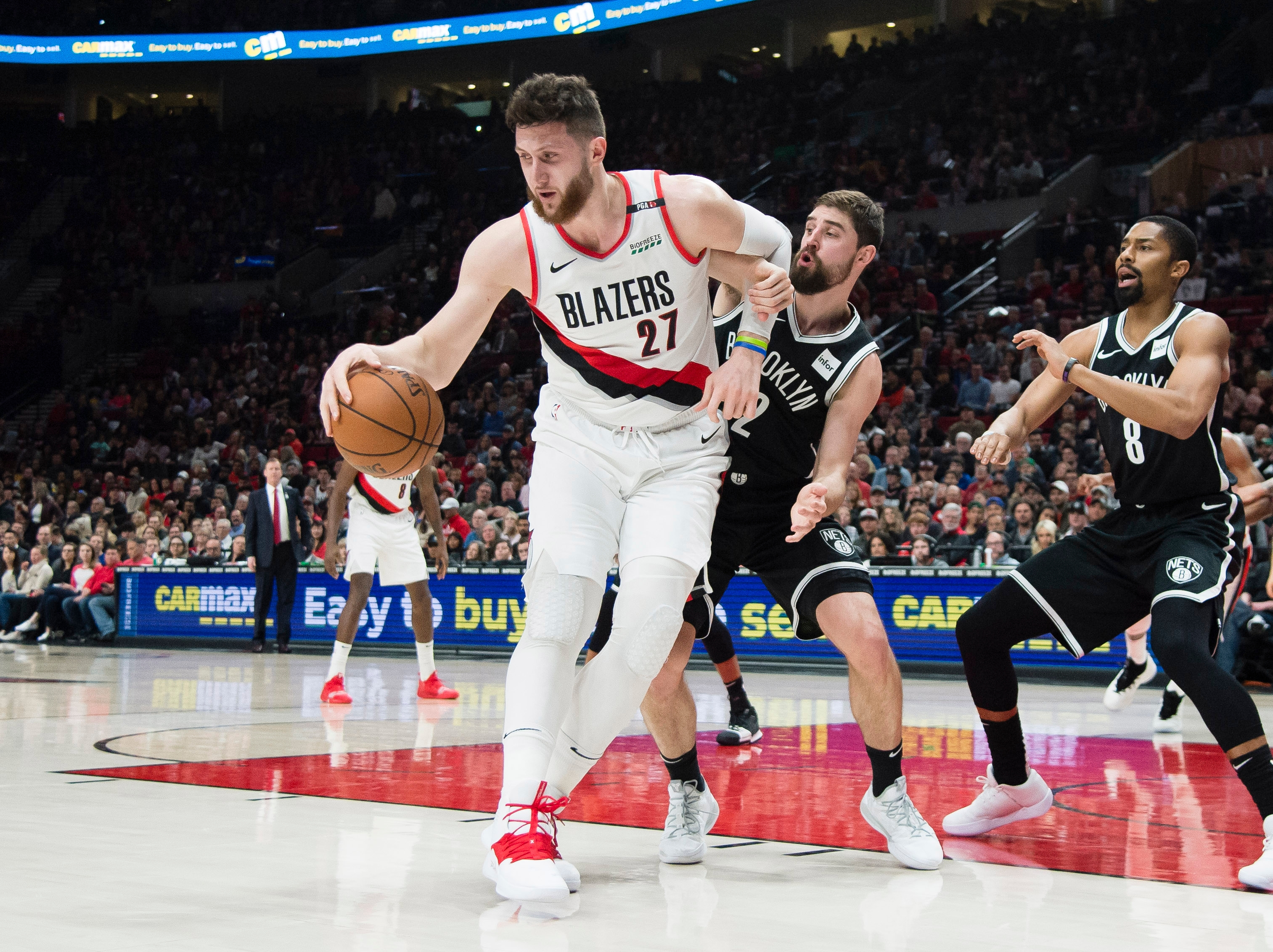 Portland Trail Blazers center Jusuf Nurkic makes a move to the basket against Brooklyn Nets forward Joe Harris and guard Spencer Dinwiddie during the first half at Moda Center. / Troy Wayrynen/USA TODAY Sports
