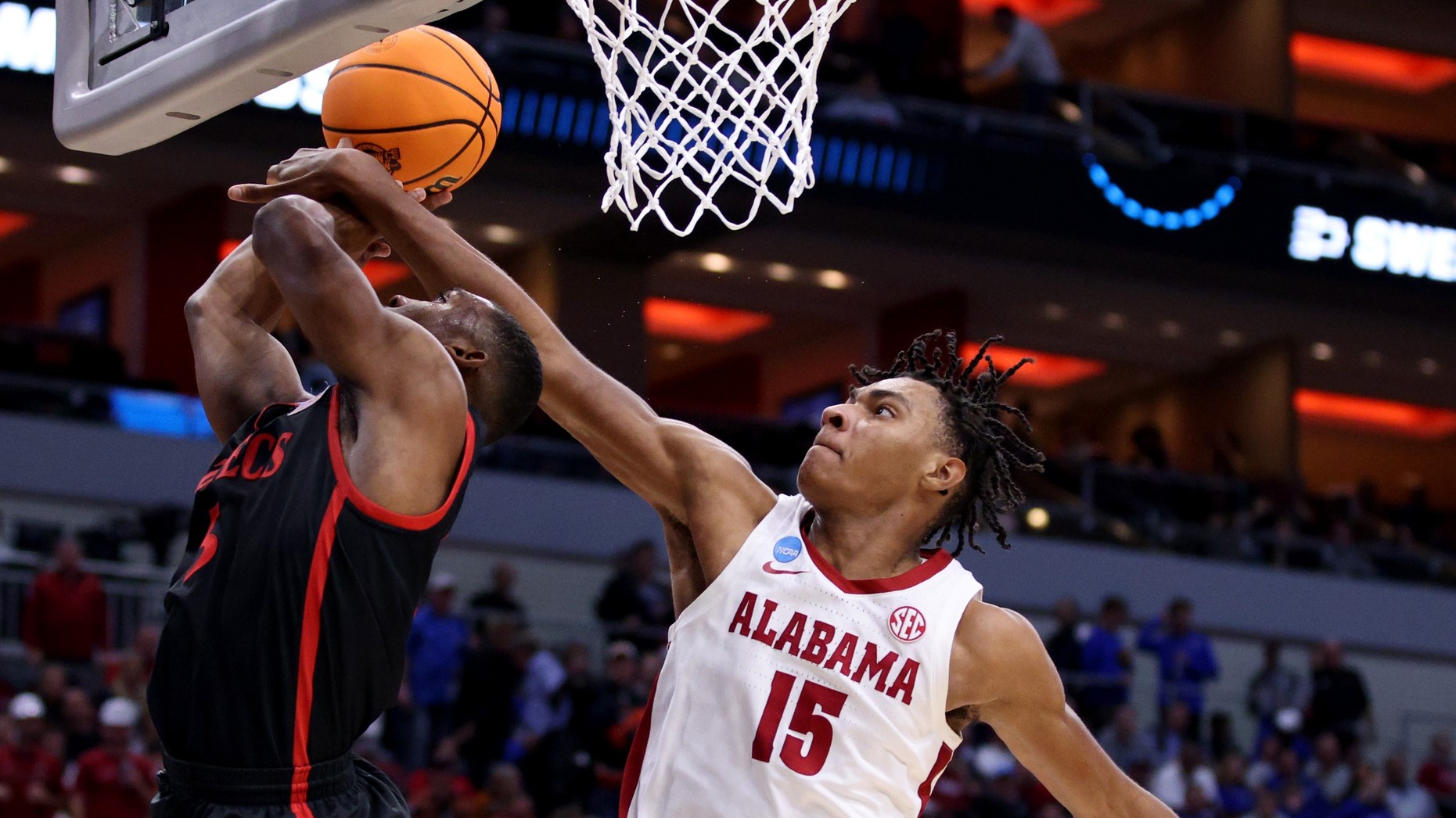 Mar 24, 2023; Louisville, KY, USA; San Diego State Aztecs guard Lamont Butler (5) shoots against Alabama Crimson Tide forward Noah Clowney (15) during the second half of the NCAA tournament round of sixteen at KFC YUM! Center. / Jordan Prather-USA TODAY Sports
