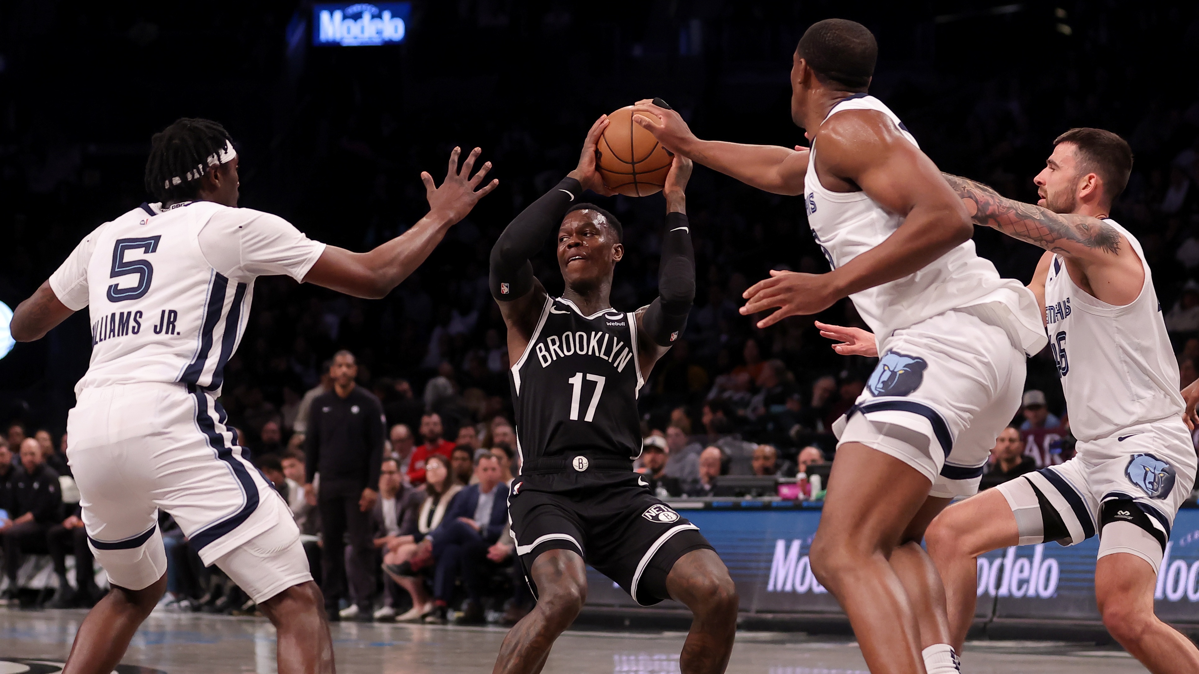 Brooklyn Nets guard Dennis Schroder (17) looks to pass the ball against Memphis Grizzlies guard Vince Williams Jr. (5) and center Trey Jemison (55) and guard John Konchar (46) during the first quarter at Barclays Center / Brad Penner - USA TODAY Sports