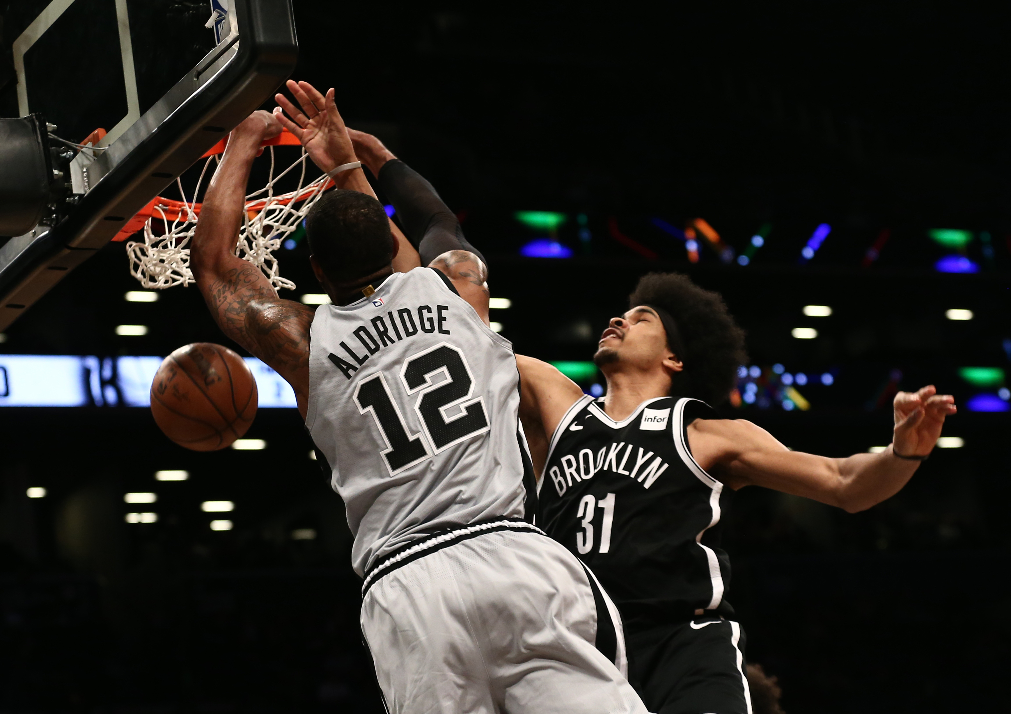 San Antonio Spurs center LaMarcus Aldridge puts up a shot against Brooklyn Nets center Jarrett Allen in the second quarter at Barclays Center. / Nicole Sweet/USA TODAY Sports