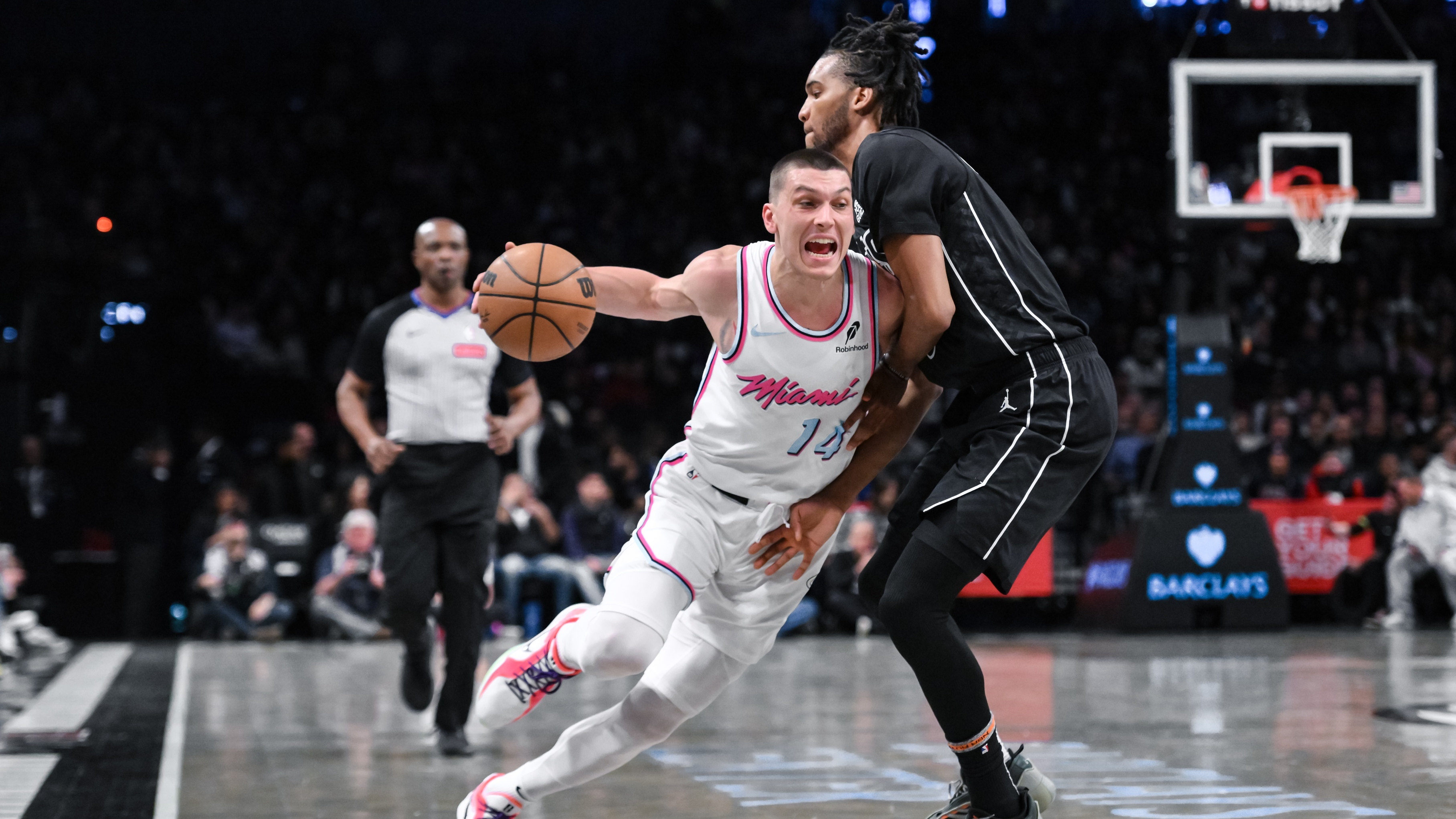 Nets fall to Heat, 106-97, spoiling Vince Carter's number retirementAll five Nets starters scored in double-digits1/26/2025, 2:28 AMAssociated PressJan 25, 2025; Brooklyn, New York, USA; Miami Heat guard Tyler Herro (14) drives past Brooklyn Nets forward Ziaire Williams (8) during the first half at Barclays Center. / John Jones-Imagn Images