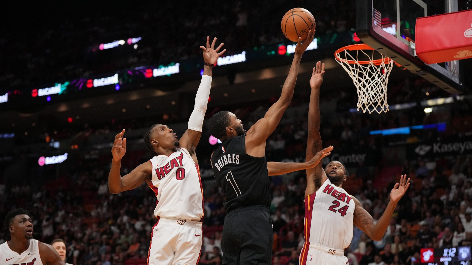 Nets use second-half rally to beat Heat 109-105Mikal Bridges had a team-high 21 points11/2/2023, 2:16 AMAssociated PressNov 1, 2023; Miami, Florida, USA; Brooklyn Nets forward Mikal Bridges (1) shoots the ball between Miami Heat guard Josh Richardson (0) and forward Haywood Highsmith (24) during the first half at Kaseya Center. / Jasen Vinlove-USA TODAY Sports