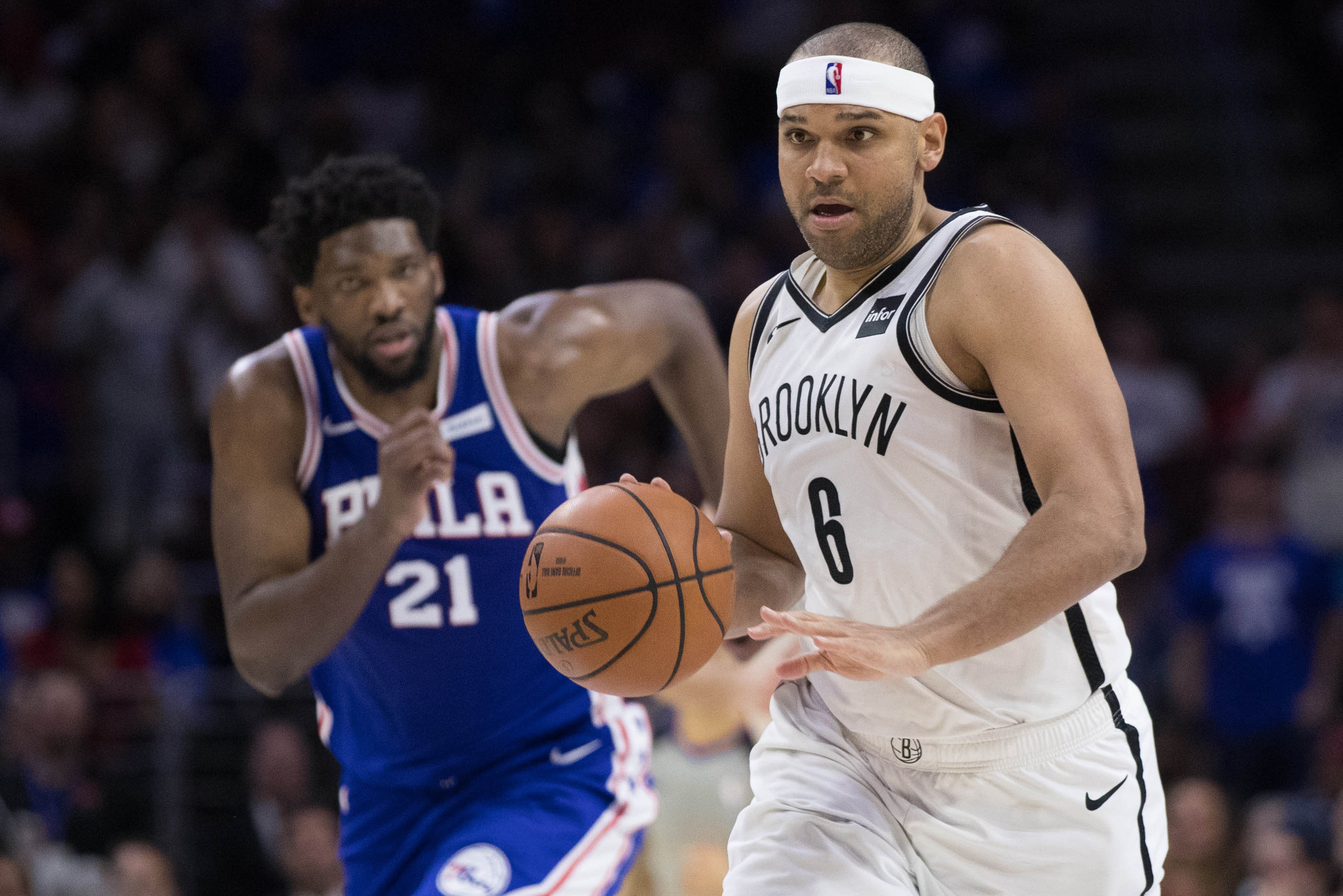 Brooklyn Nets forward Jared Dudley dribbles past Philadelphia 76ers center Joel Embiid during the fourth quarter in Game 1 of the first round of the 2019 NBA playoffs at Wells Fargo Center. / Bill Streicher/USA TODAY Sports