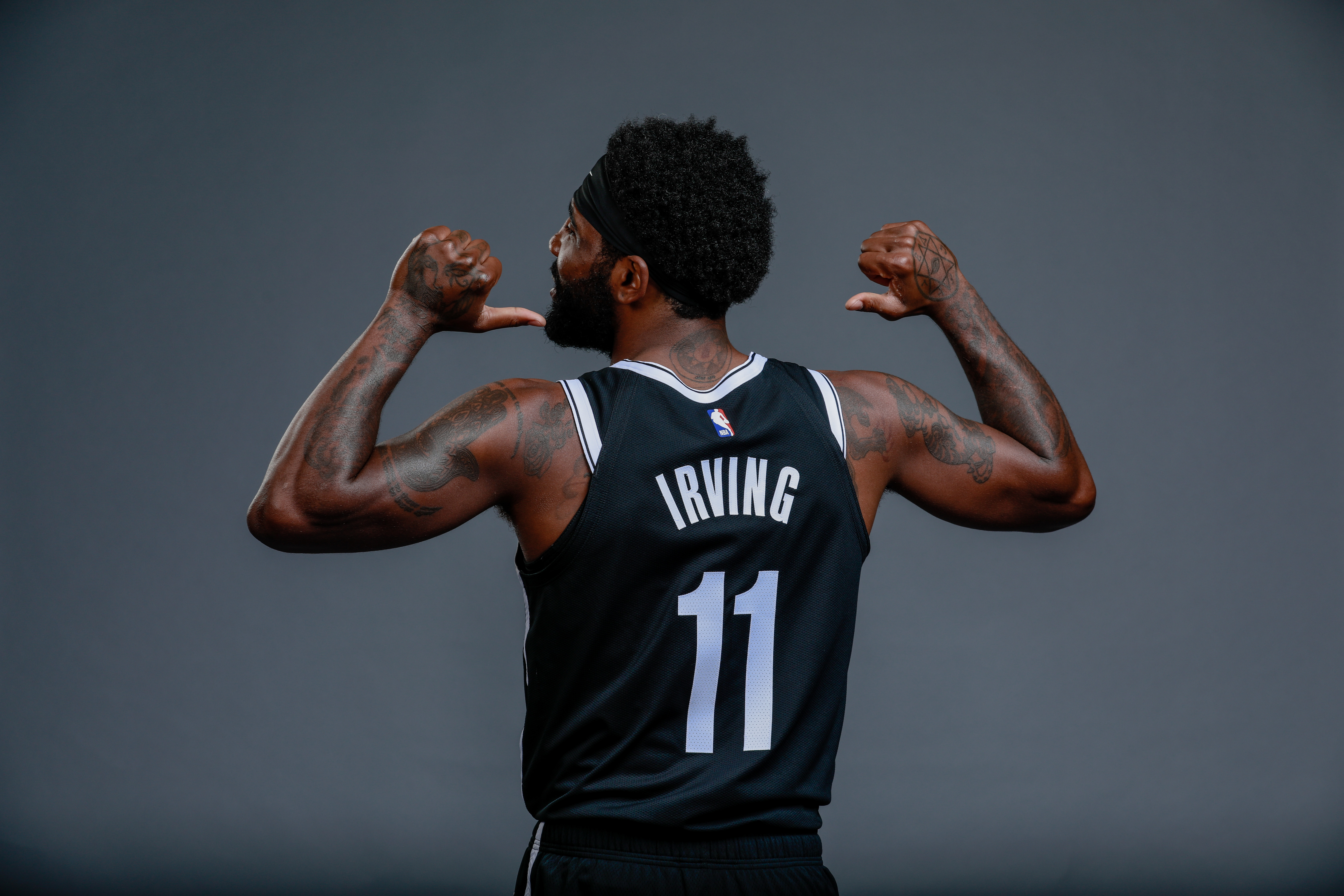 Sep 27, 2019; Brooklyn, NY, USA; Brooklyn Nets guard Kyrie Irving (11) poses for a portrait during media day at HSS Training Center. Mandatory Credit: Nicole Sweet-USA TODAY Sports / Nicole Sweet