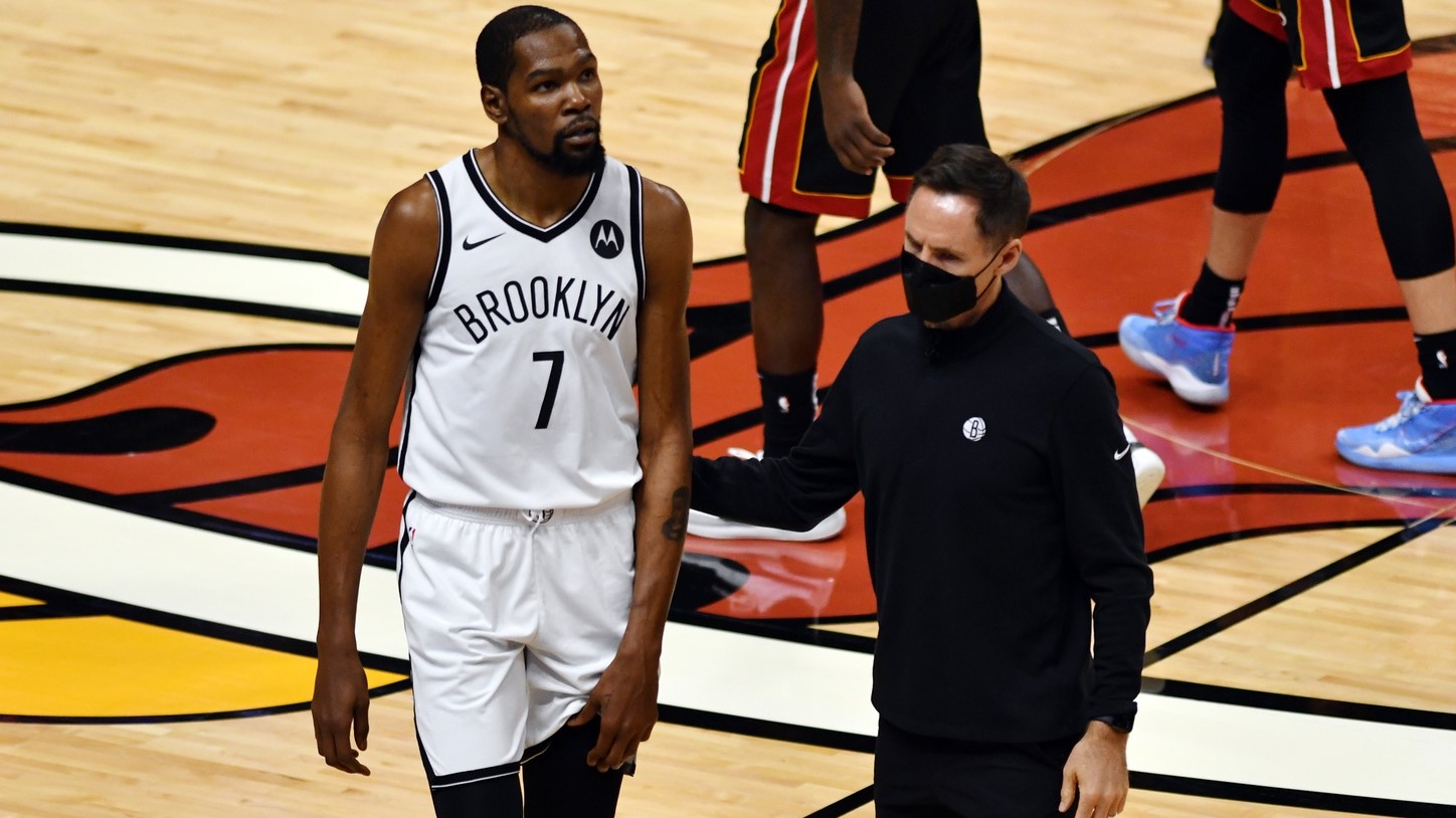Nets' Kevin Durant exits Sunday's game vs. Heat with left thigh contusionDurant scored eight points in just four minutes of action4/18/2021, 8:35 PMColin MartinFreelance Editorial Producer