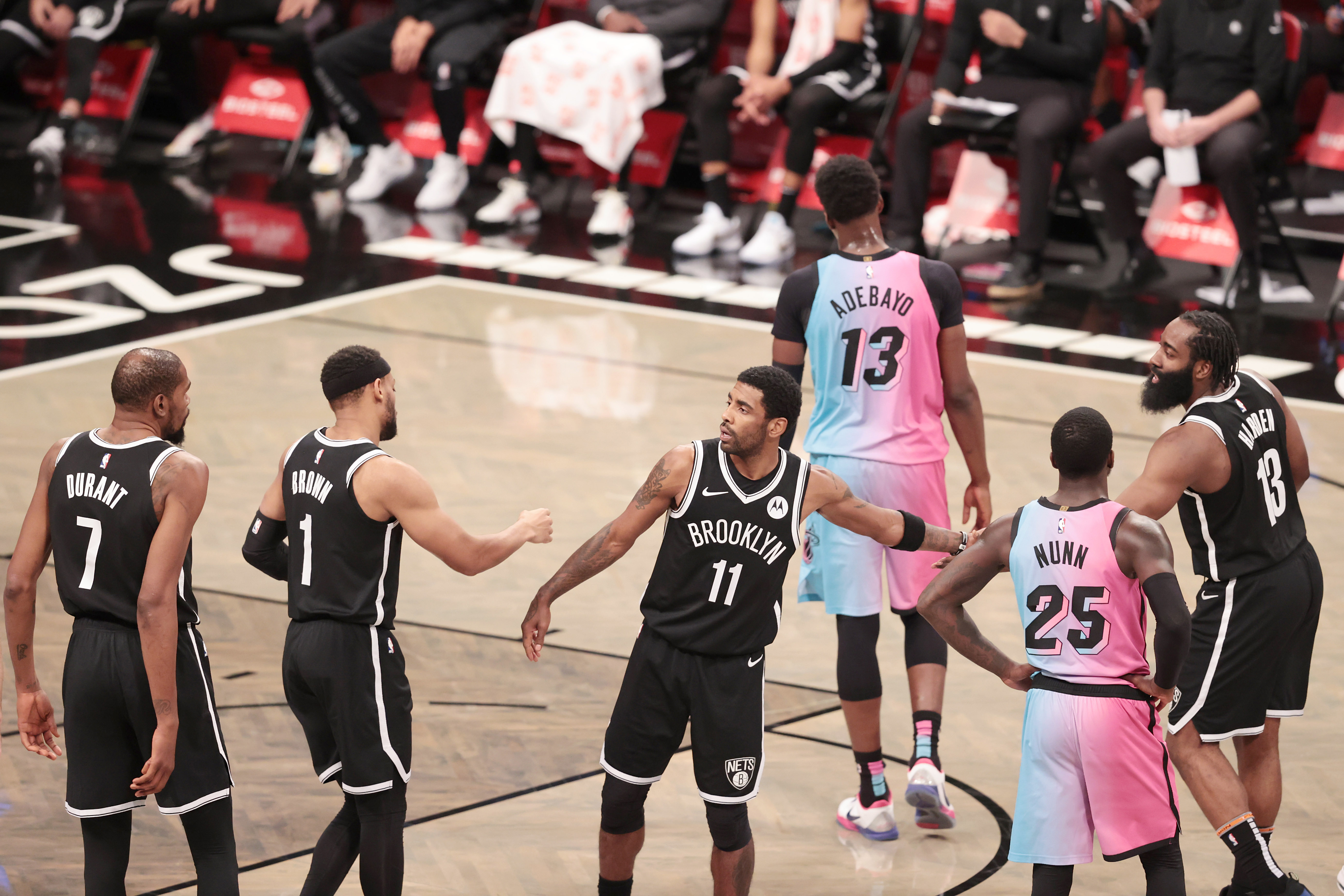 Jan 23, 2021; Brooklyn, New York, USA; Brooklyn Nets guard Kyrie Irving (11) slaps hands with guard James Harden (13) while talking with guard Bruce Brown (1) and forward Kevin Durant (7) during the first half against the Miami Heat at Barclays Center. Mandatory Credit: Vincent Carchietta-USA TODAY Sports / Vincent Carchietta-USA TODAY Sports