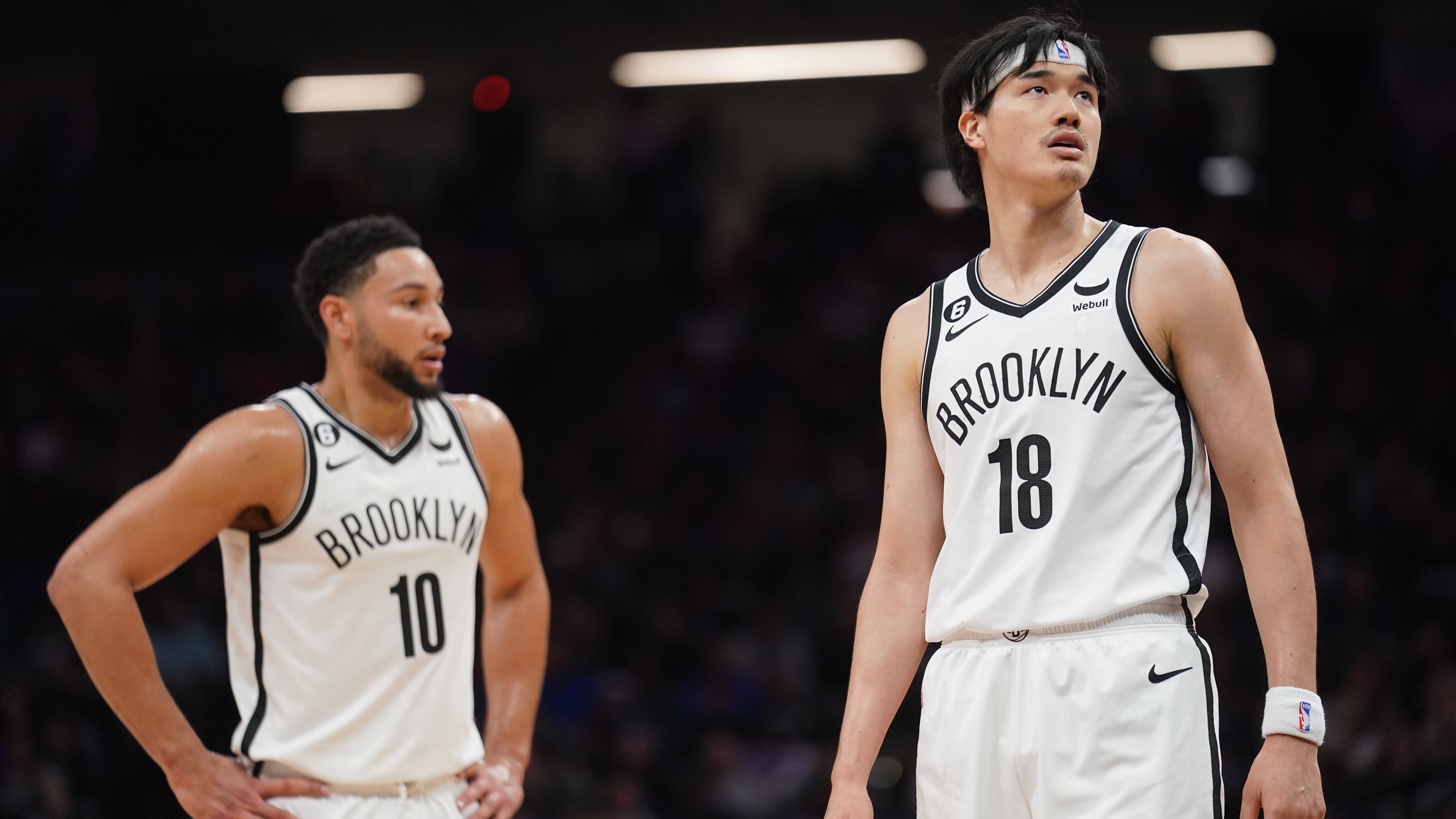 Nov 15, 2022; Sacramento, California, USA; Brooklyn Nets guard Yuta Watanabe (18) stands on the court before a jump ball against the Sacramento Kings in the second quarter at the Golden 1 Center. / Cary Edmondson-USA TODAY Sports