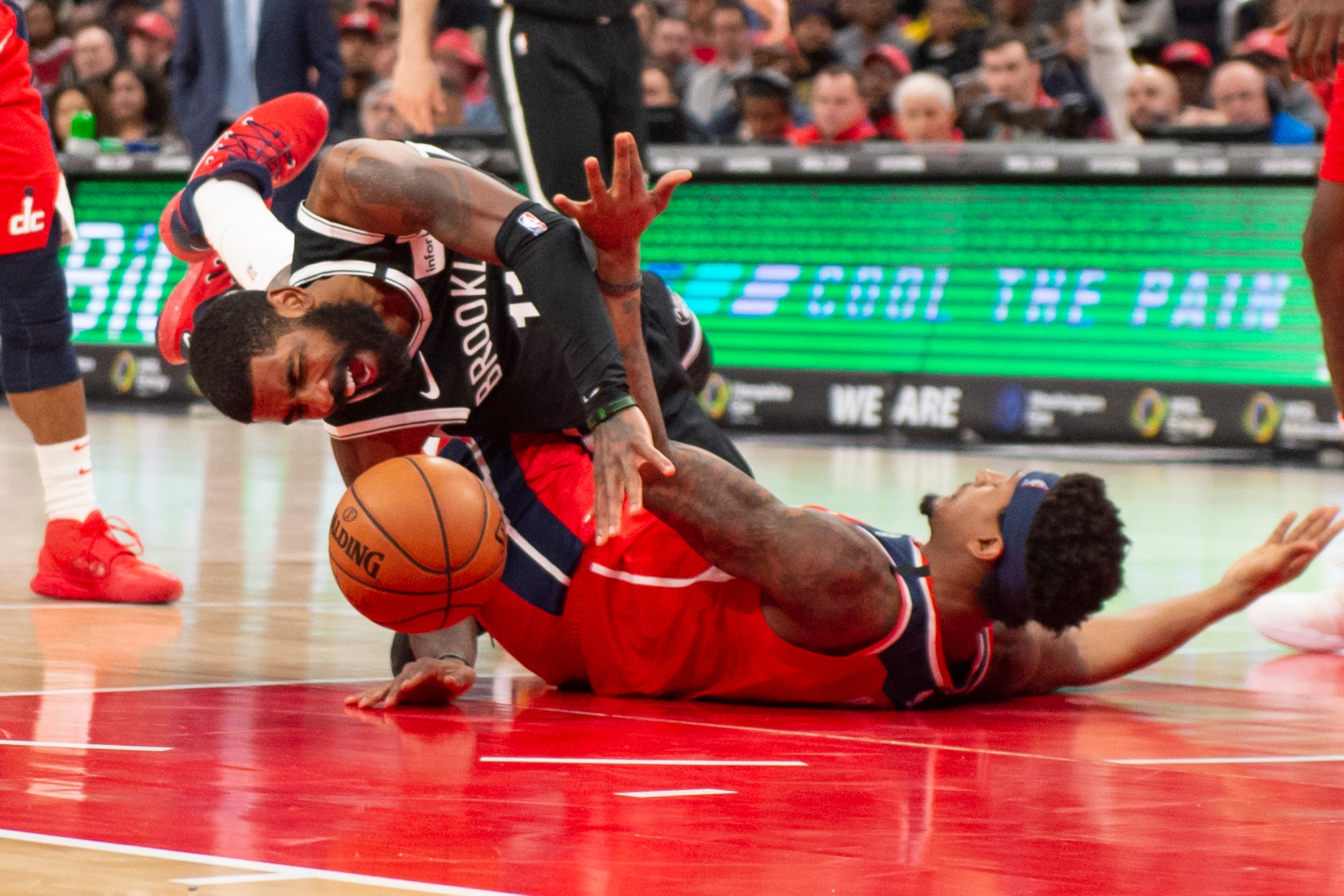 Feb 1, 2020; Washington, District of Columbia, USA; Brooklyn Nets guard Kyrie Irving (11) reacts after getting his legs tangled swithb Washington Wizards guard Bradley Beal (3) during the fourth quarter at Capital One Arena. Mandatory Credit: Tommy Gilligan-USA TODAY Sports / Tommy Gilligan