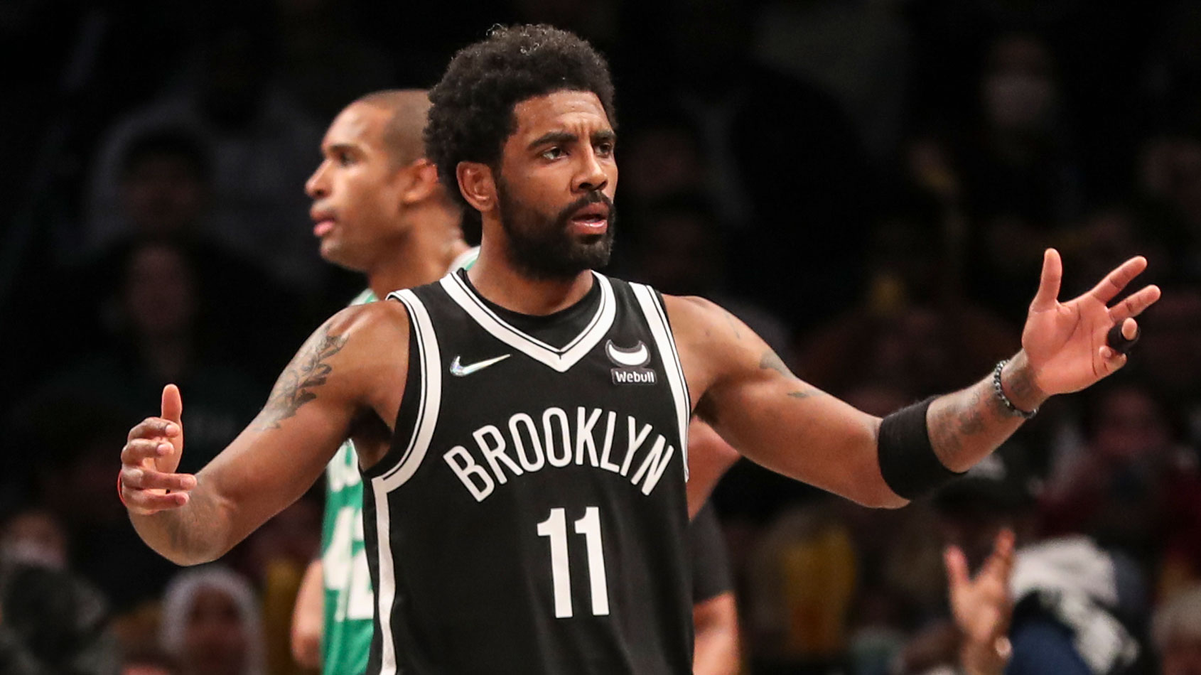 Apr 17, 2022; Boston, Massachusetts, USA; Brooklyn Nets guard Kyrie Irving (11) shoots against Boston Celtics guard Marcus Smart (36) in the first quarter during game one of the first round for the 2022 NBA playoffs at TD Garden. / David Butler II-USA TODAY Sports