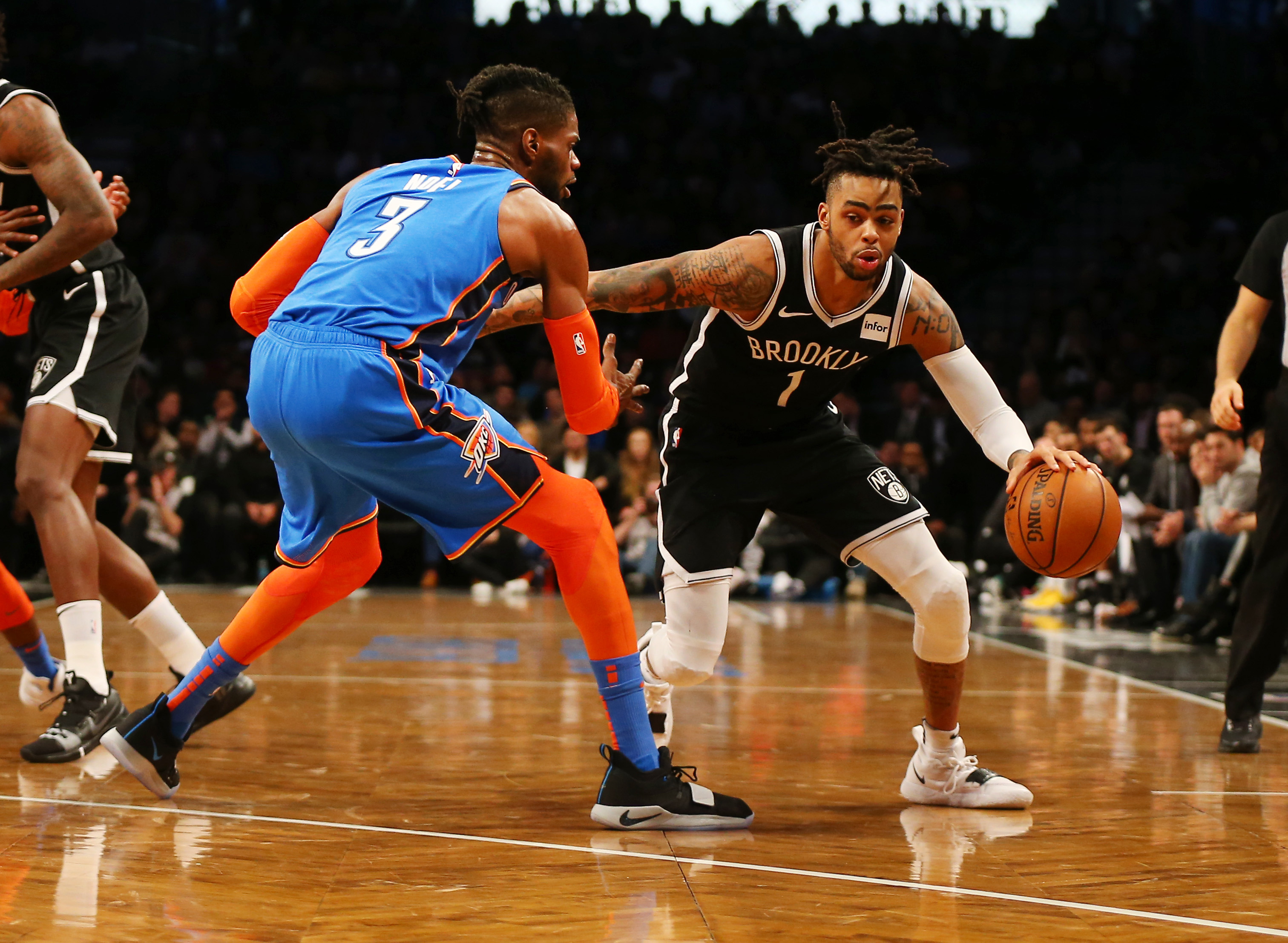 Dec 5, 2018; Brooklyn, NY, USA; Brooklyn Nets guard D'Angelo Russell (1) dribbles the ball against Oklahoma City Thunder forward Nerlens Noel (3) during the second half at Barclays Center. Mandatory Credit: Andy Marlin-USA TODAY Sports / Andy Marlin
