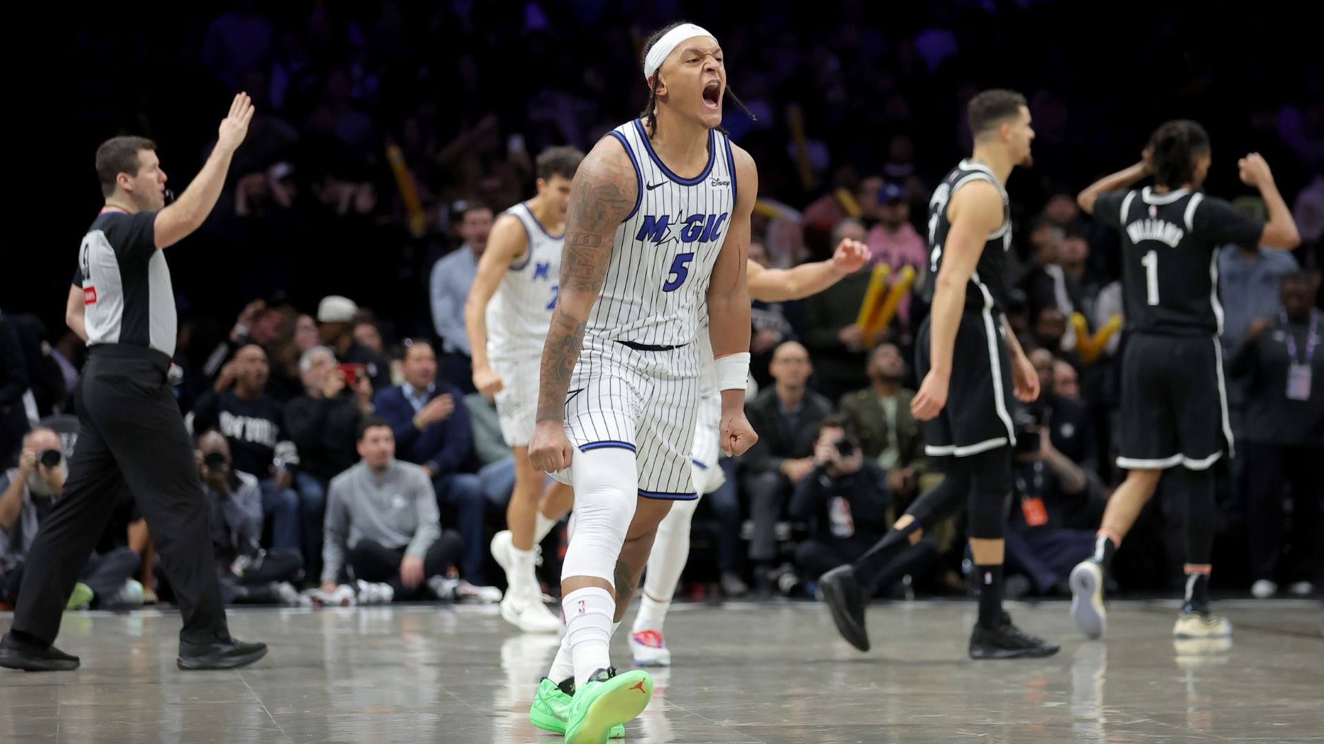 Nets fall to Magic in OT, 104-103, on Paolo Banchero's buzzer-beaterRookie Egor Dёmin's heroics came up just short for Brooklyn1/8/2026, 3:40 AMAssociated PressJan 7, 2026; Brooklyn, New York, USA; Orlando Magic forward Paolo Banchero (5) celebrates his overtime game-winning three point shot against the Brooklyn Nets at Barclays Center. / Brad Penner-Imagn Images