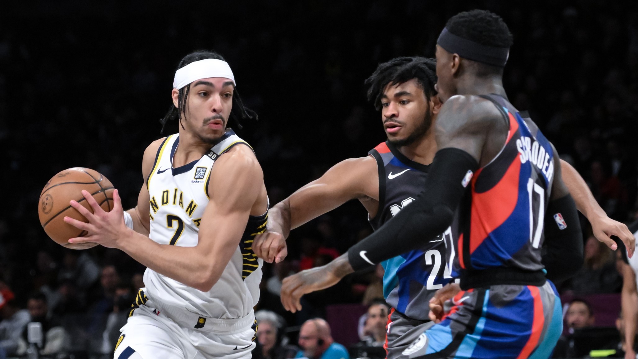 Apr 3, 2024; Brooklyn, New York, USA; Indiana Pacers guard Andrew Nembhard (2) drives to the basket while being defended by Brooklyn Nets guard Cam Thomas (24) and Brooklyn Nets guard Dennis Schroder (17) during the first quarter at Barclays Center. / John Jones-USA TODAY Sports