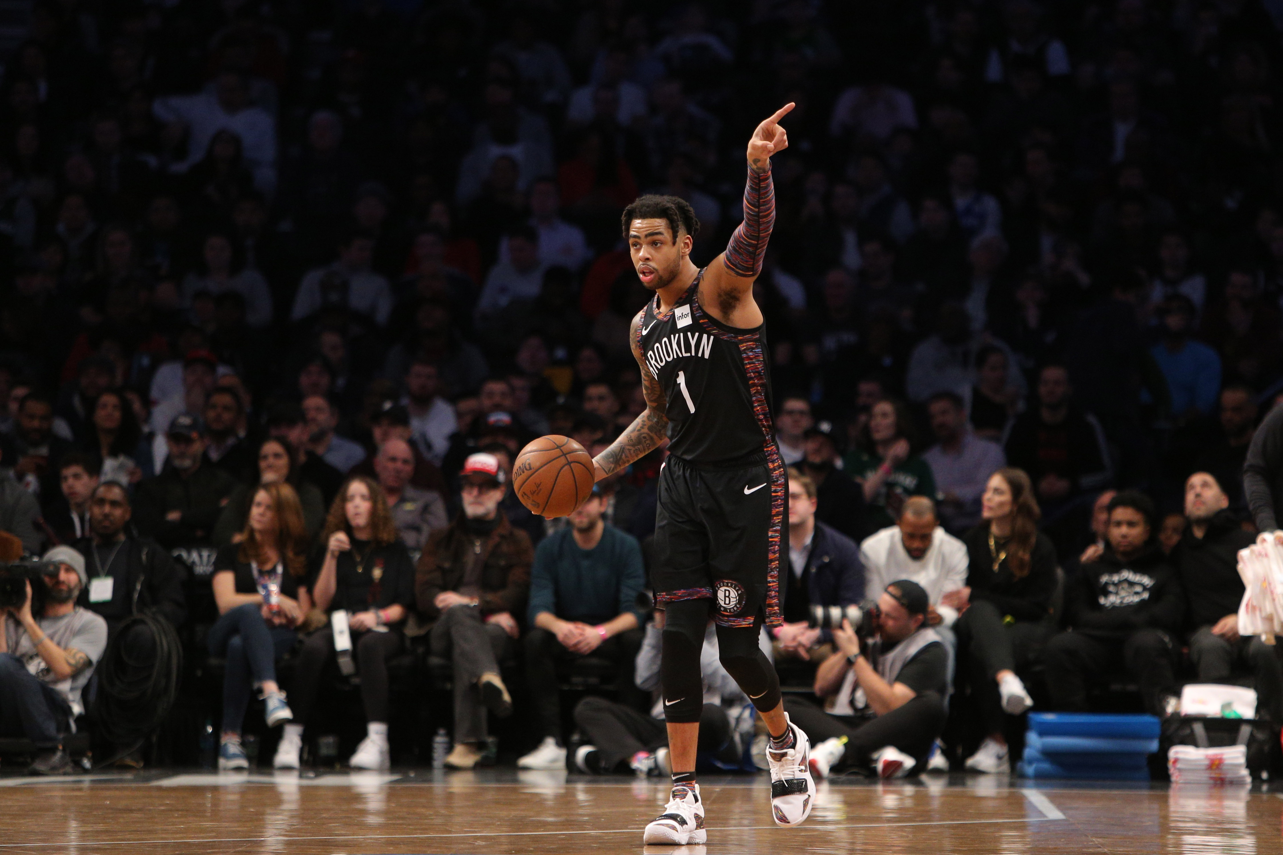 Nets return home to face road-weary SpursSpurs lost at Madison Square Garden on Sunday2/25/2019, 10:10 PMBrooklyn Nets point guard D'Angelo Russell directs his teammates during the second quarter against the Milwaukee Bucks at Barclays Center. / Brad Penner/USA TODAY Sports
