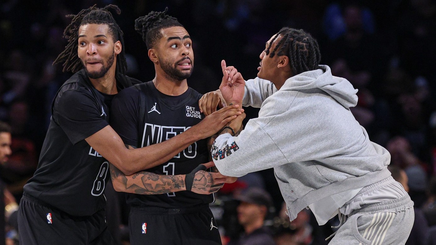 Feb 4, 2025; Brooklyn, New York, USA; Brooklyn Nets guard D'Angelo Russell (1) celebrates with teammates after making the game-winning three point basket with 3.1 seconds remaining in the fourth quarter to defeat the Houston Rockets at Barclays Center. / Vincent Carchietta-Imagn Images
