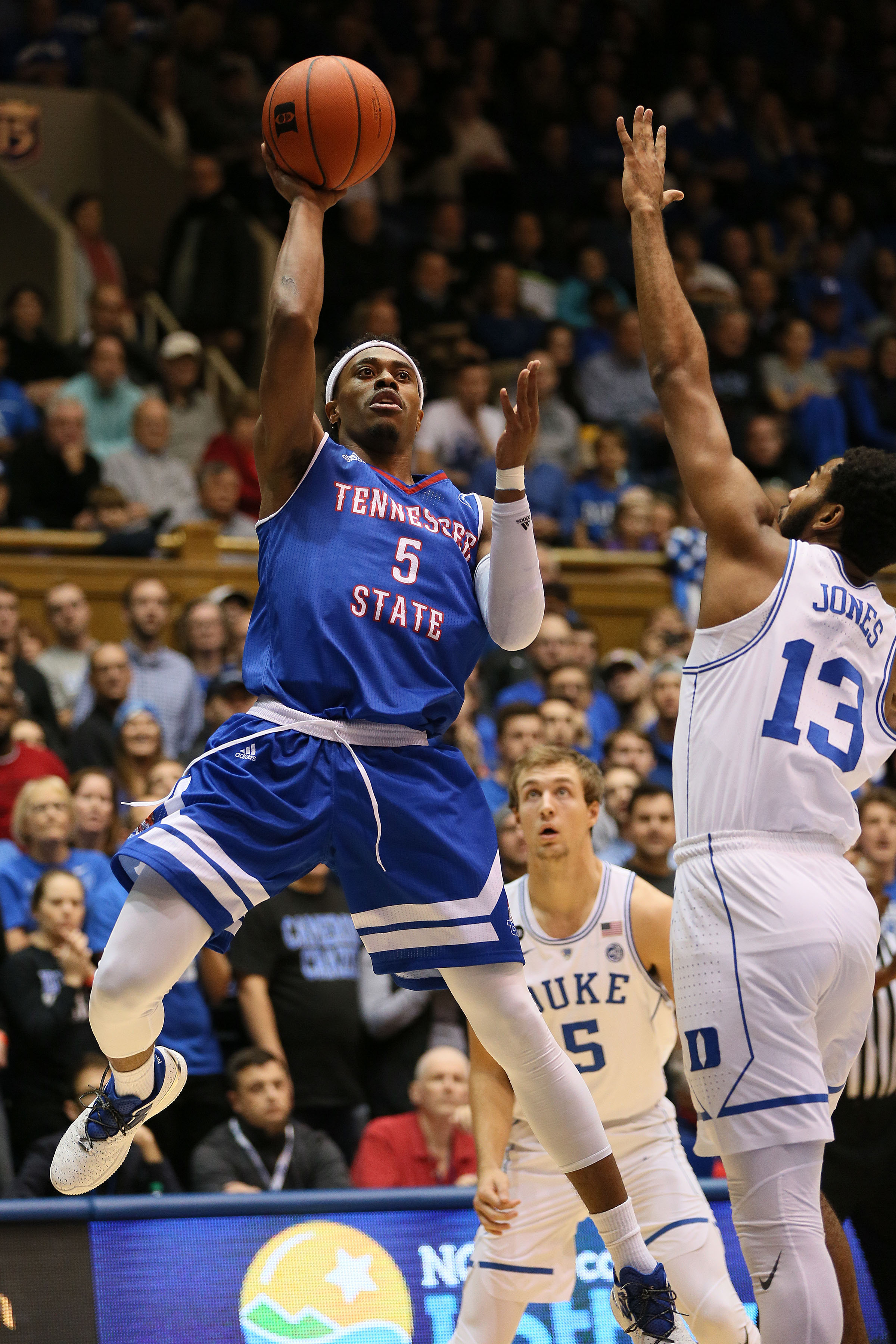 Dec 19, 2016; Durham, NC, USA; Tennessee State Tigers guard Tahjere McCall (5) shoots against Duke Blue Devils guard Matt Jones (13) in the first half of their game at Cameron Indoor Stadium. Mandatory Credit: Mark Dolejs-USA TODAY Sports / Mark Dolejs