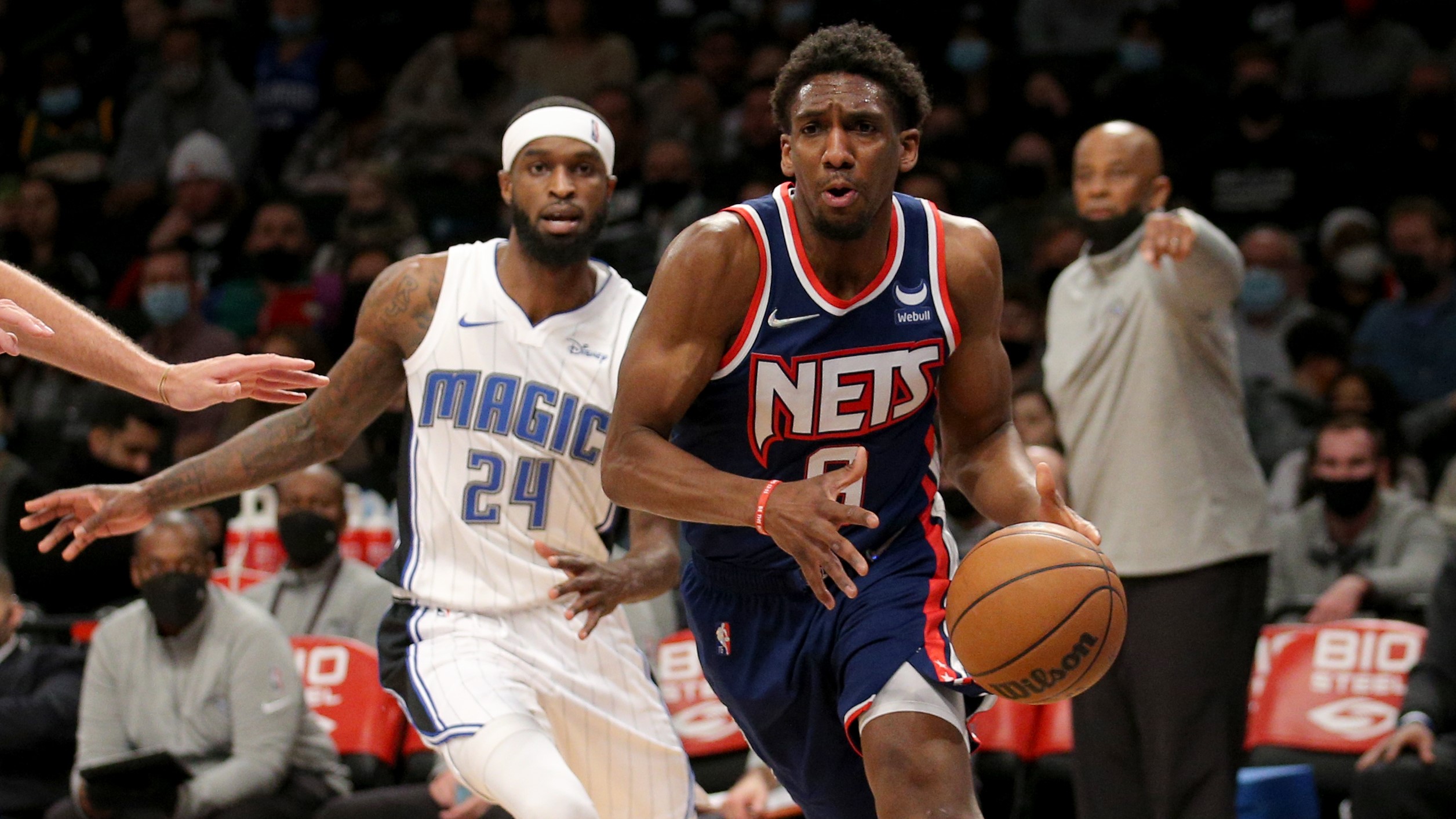 Dec 18, 2021; Brooklyn, New York, USA; Brooklyn Nets guard Langston Galloway (9) drives to the basket against Orlando Magic center Robin Lopez (33) and guard B.J. Johnson (24) during the first quarter at Barclays Center. Mandatory Credit: Brad Penner-USA TODAY Sports / Brad Penner-USA TODAY Sports