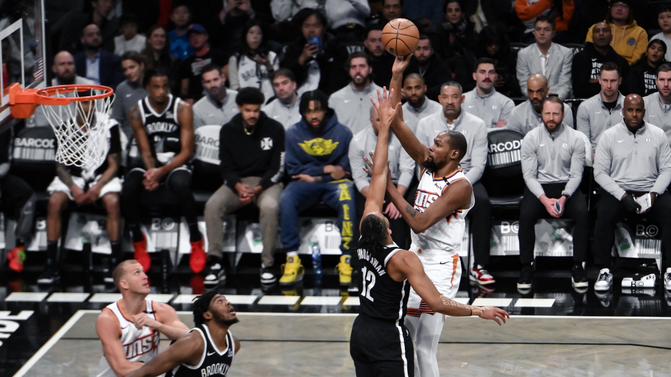 Nets' losing streak extends to five games with 108-84 loss to Kevin Durant, SunsDurant, Devin Booker combined for 56 points1/23/2025, 2:57 AMAssociated PressJan 22, 2025; Brooklyn, New York, USA; Phoenix Suns forward Kevin Durant (35) shoots the ball against Brooklyn Nets forward Tosan Evbuomwan (12) during the first half at Barclays Center. / John Jones-Imagn Images