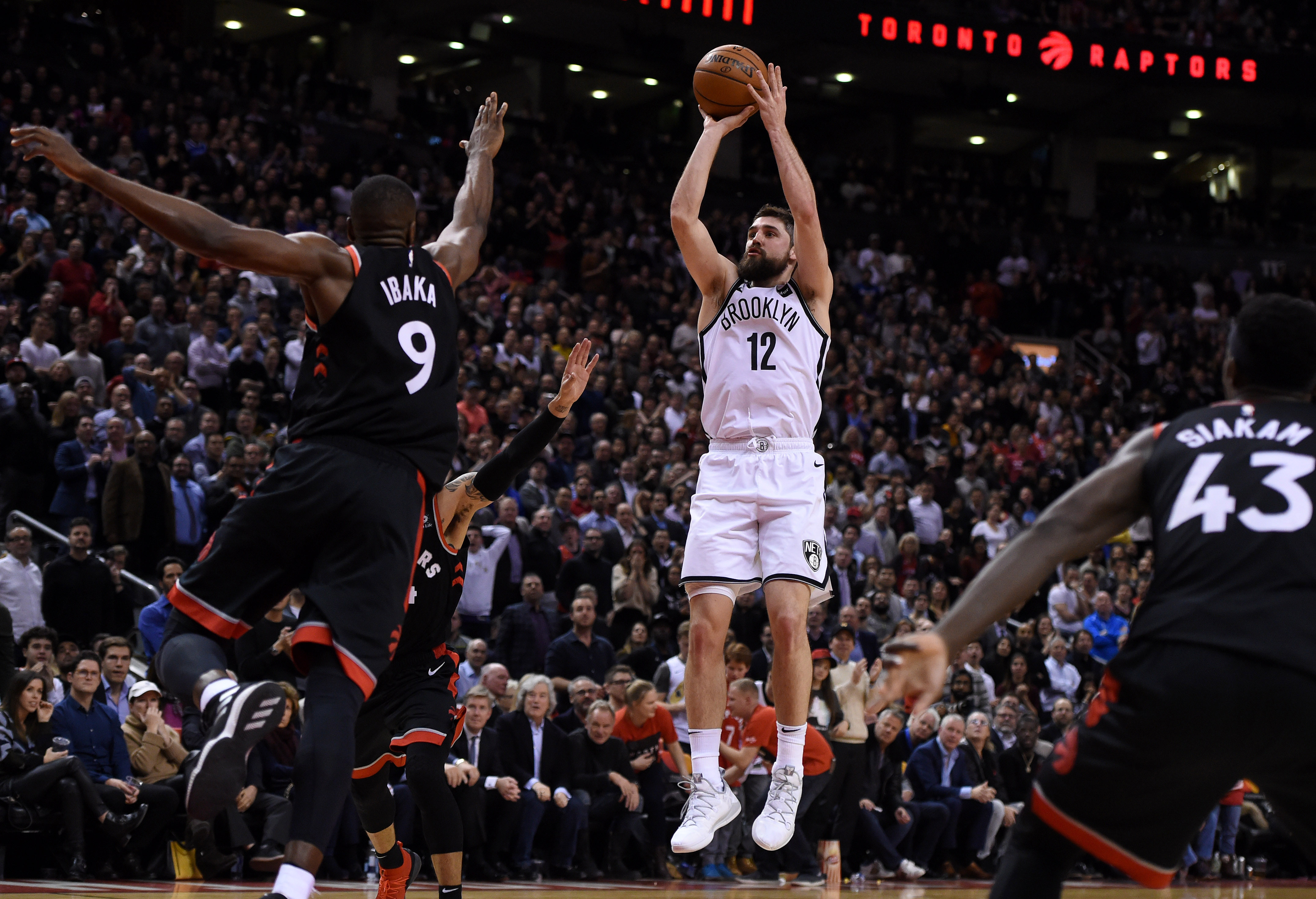 Feb 11, 2019; Toronto, Ontario, CAN; Brooklyn Nets forward Joe Harris (12) shoots for a basket against Toronto Raptors in the second half at Scotiabank Arena. Mandatory Credit: Dan Hamilton-USA TODAY Sports / Dan Hamilton