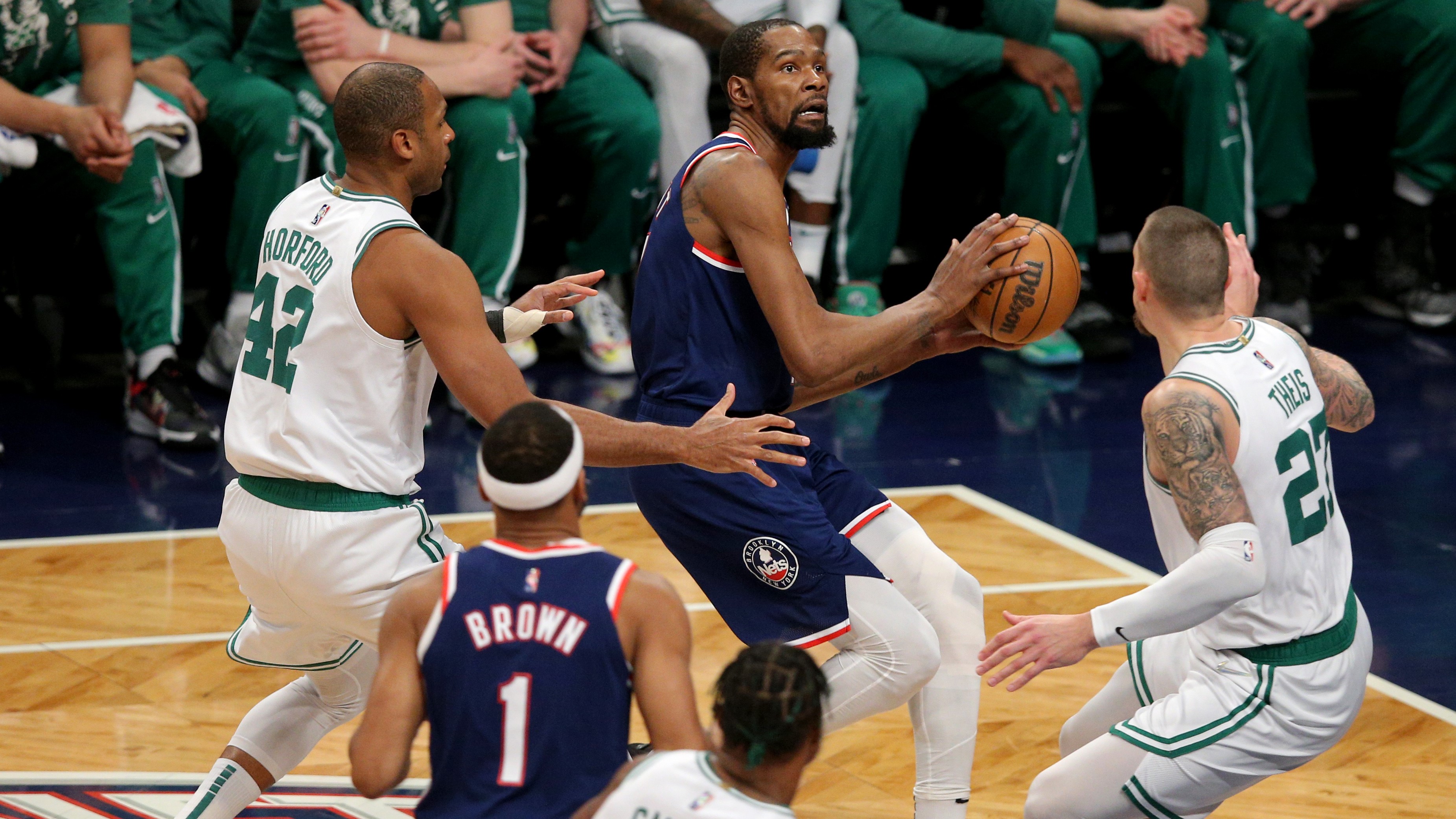 Apr 25, 2022; Brooklyn, New York, USA; Brooklyn Nets forward Kevin Durant (7) drives to the basket against Boston Celtics center Al Horford (42) and center Daniel Theis (27) during the first quarter of game four of the first round of the 2022 NBA playoffs at Barclays Center. / Brad Penner-USA TODAY Sports