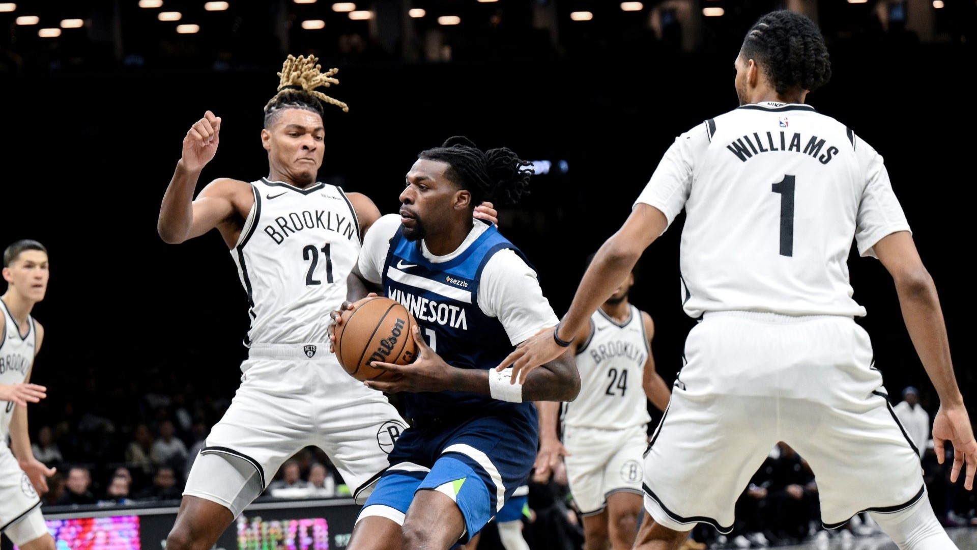 Nov 3, 2025; Brooklyn, New York, USA; Minnesota Timberwolves center Naz Reid (11) drives to the basket while defended by Brooklyn Nets forward Noah Clowney (21) and forward Ziaire Williams (1) during the first half at Barclays Center. / John Jones-Imagn Images