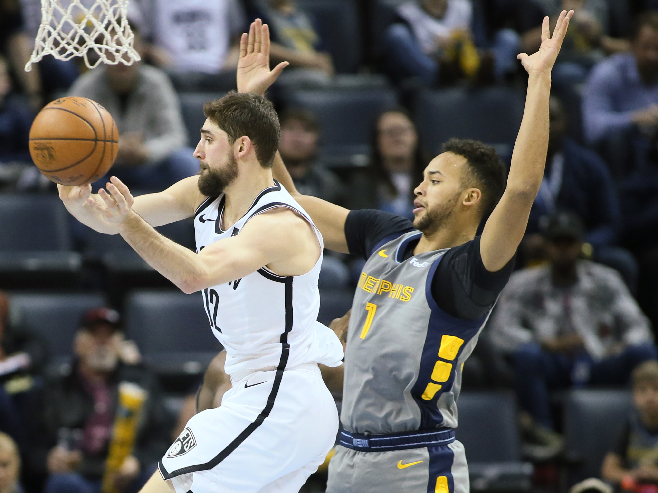 Jan 4, 2019; Memphis, TN, USA; Brooklyn Nets guard Joe Harris (12) passes as Memphis Grizzlies forward Kyle Anderson (1) defends in the first half at FedExForum. Mandatory Credit: Nelson Chenault-USA TODAY Sports / Nelson Chenault