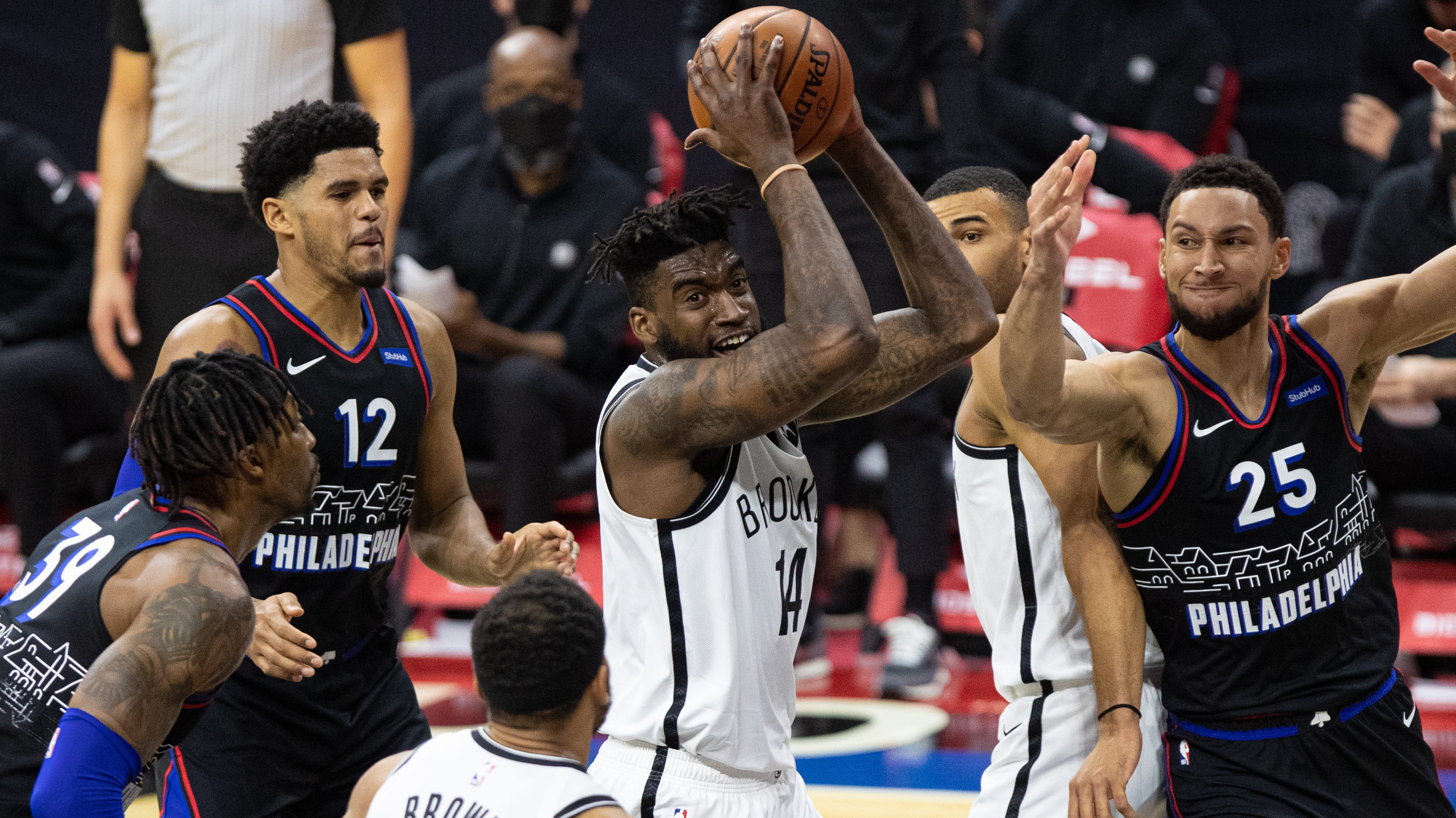 Nets waive Norvel Pelle, sign Andre RobersonPlayed with the Nets for just three weeks2/16/2021, 6:28 AMCoby GreenFreelance Editorial ProducerFeb 6, 2021; Philadelphia, Pennsylvania, USA; Brooklyn Nets forward Norvel Pelle (14) controls the ball against Philadelphia 76ers guard Ben Simmons (25) and center Dwight Howard (39) during the second quarter at Wells Fargo Center. / © Bill Streicher-USA TODAY Sports