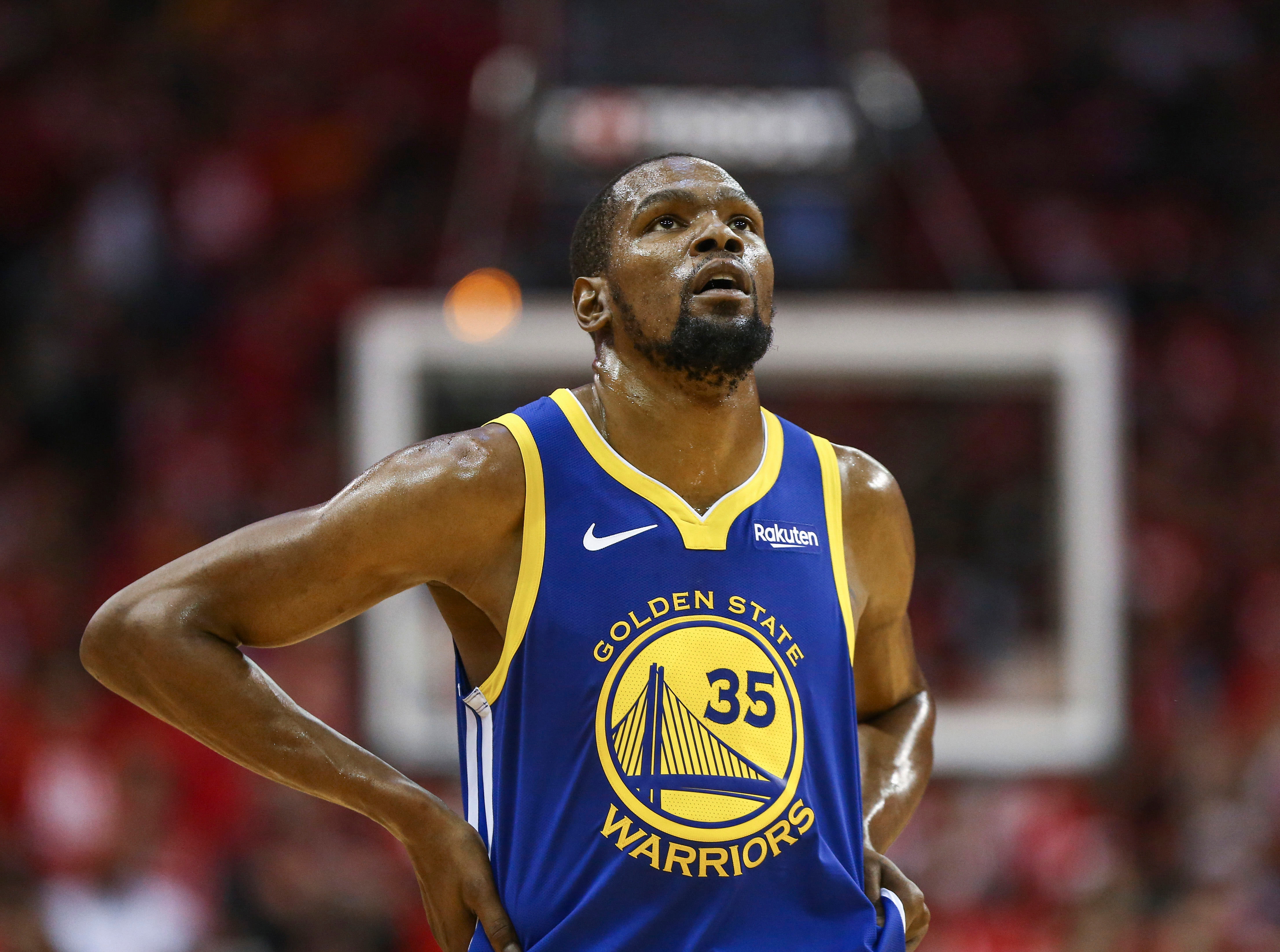 May 6, 2019; Houston, TX, USA; Golden State Warriors forward Kevin Durant (35) reacts after a play during the third quarter against the Houston Rockets in game four of the second round of the 2019 NBA Playoffs at Toyota Center. Mandatory Credit: Troy Taormina-USA TODAY Sports / Troy Taormina